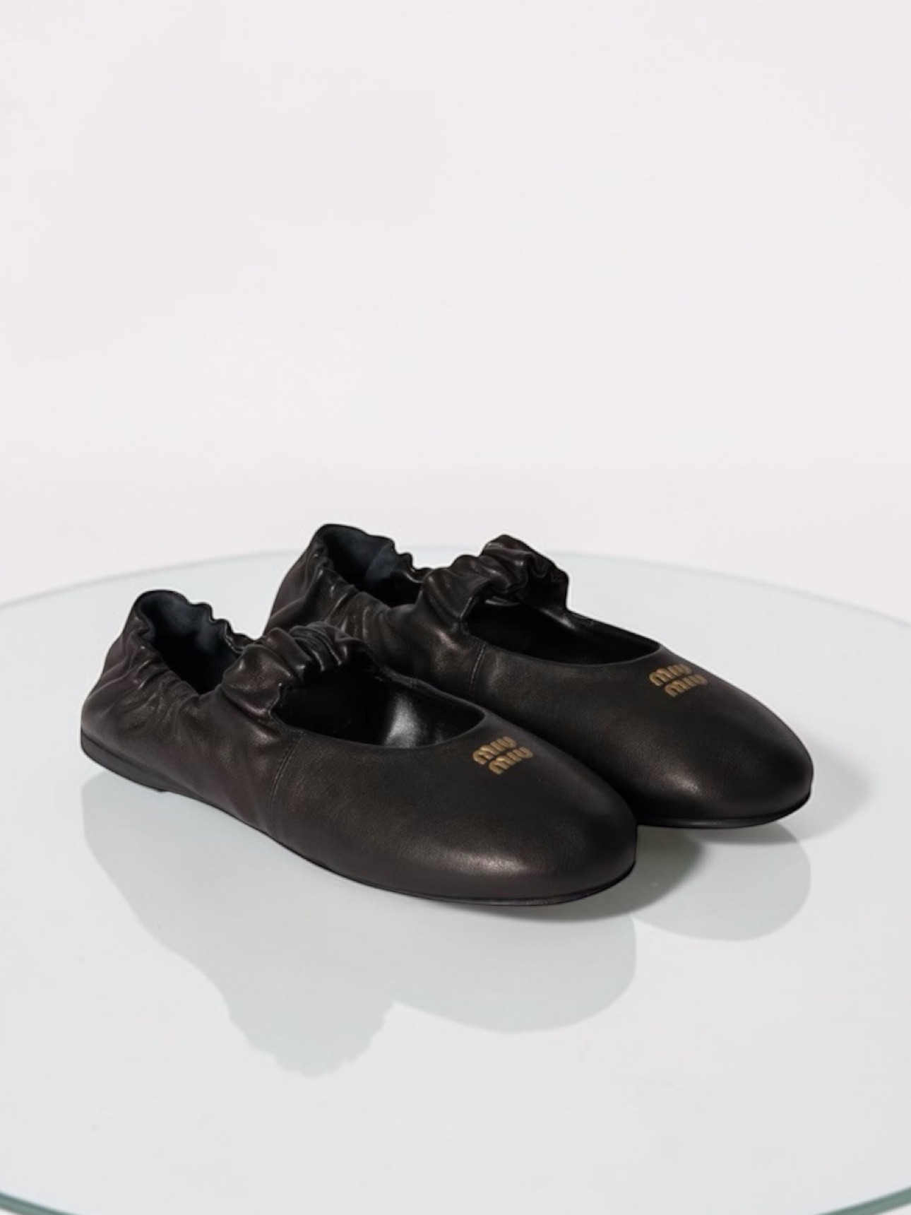 Балетки Miu Miu с округлым мысом. Модель украшена эластичной вставкой на пятке для удобства и ремешком с рюшами, добавляющим нежности и женственности. Подошва изготовлена из резины, что обеспечивает гибкость и хорошее сцепление с поверхностью, делая обувь не только стильной, но и практичной.