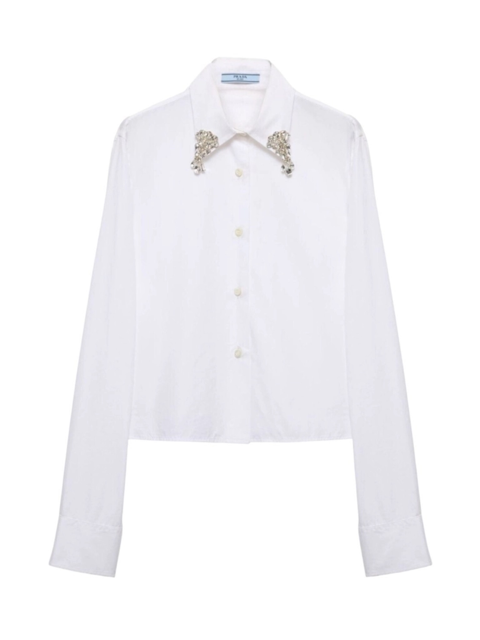 Блуза Prada - образец итальянской элегантности в классическом крое. Модель из 100% хлопка поплин с прямой линией подола и отложным воротником. Застежка спереди на пуговицы, длинные рукава дополнены манжетами на пуговицах для регулировки. Узнаваемый штрих - треугольный эмалированный логотип Prada на спинке. Идеальная основа для делового и повседневного гардероба.