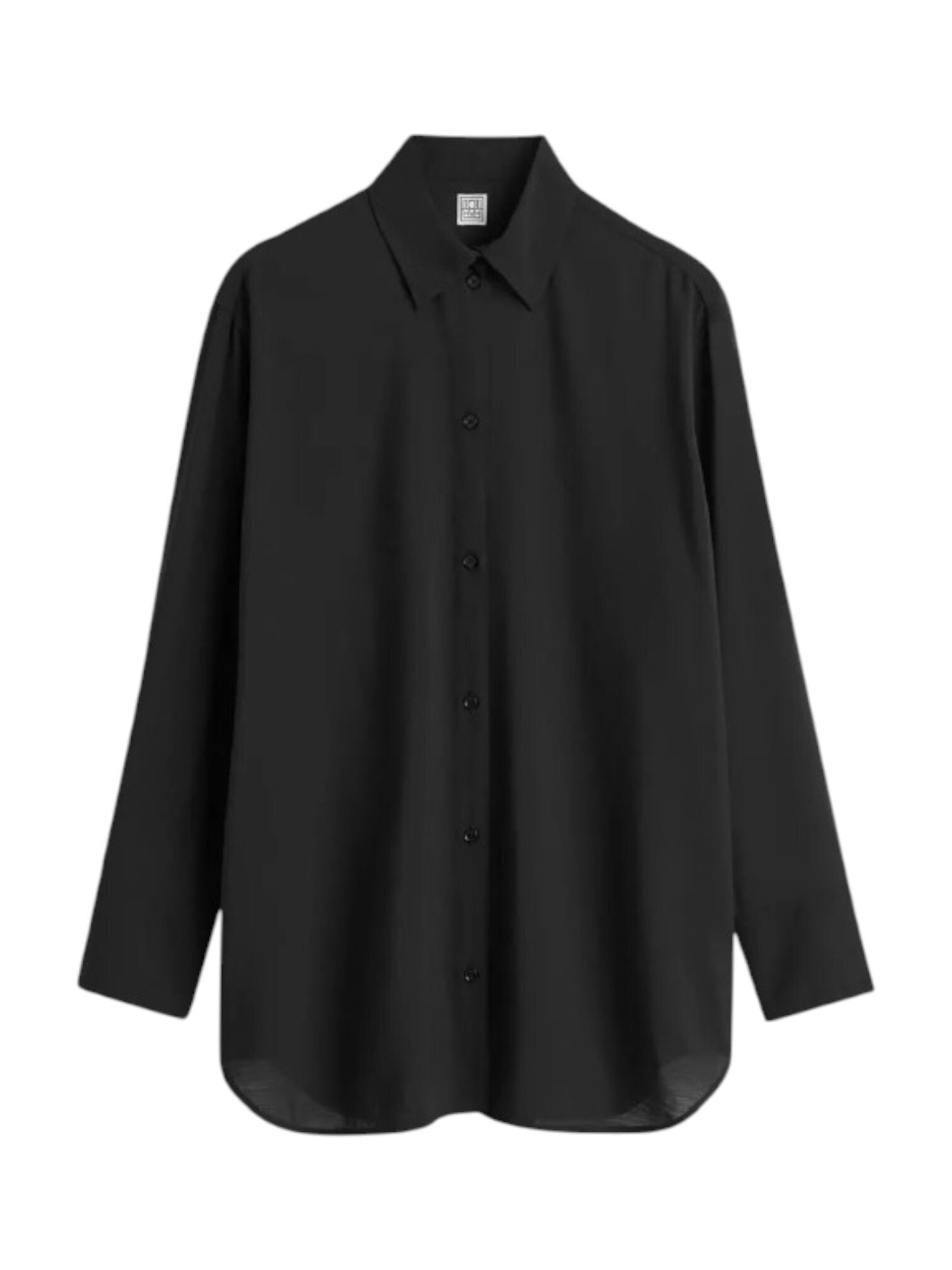 Блуза Totême - мастерский баланс между сдержанной формой и чувственной лёгкостью. Её силуэт строится на безупречно точных линиях: классический воротник, длинные рукава с манжетами на пуговицах и элегантный закруглённый низ, который мягко обрамляет фигуру. Полупрозрачность ткани добавляет образу тонкую многослойность и игру контрастов, позволяя сочетать строгость кроя с невесомостью материала. Блуза идеально подходит для создания сложного, но гармоничного лука: её можно надеть поверх тонкого топа или тела, заправить в брюки для строгого образа или оставить навыпуск с джинсами для лёгкой небрежности.