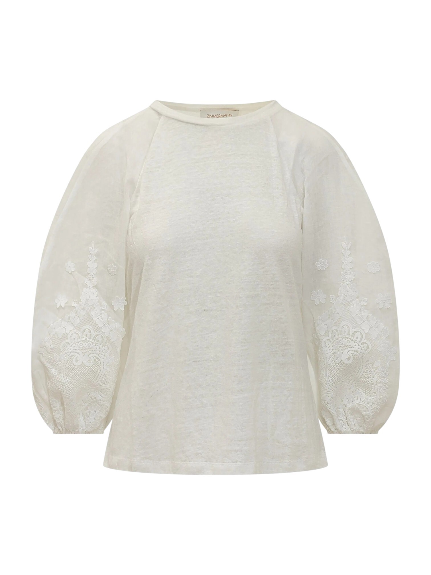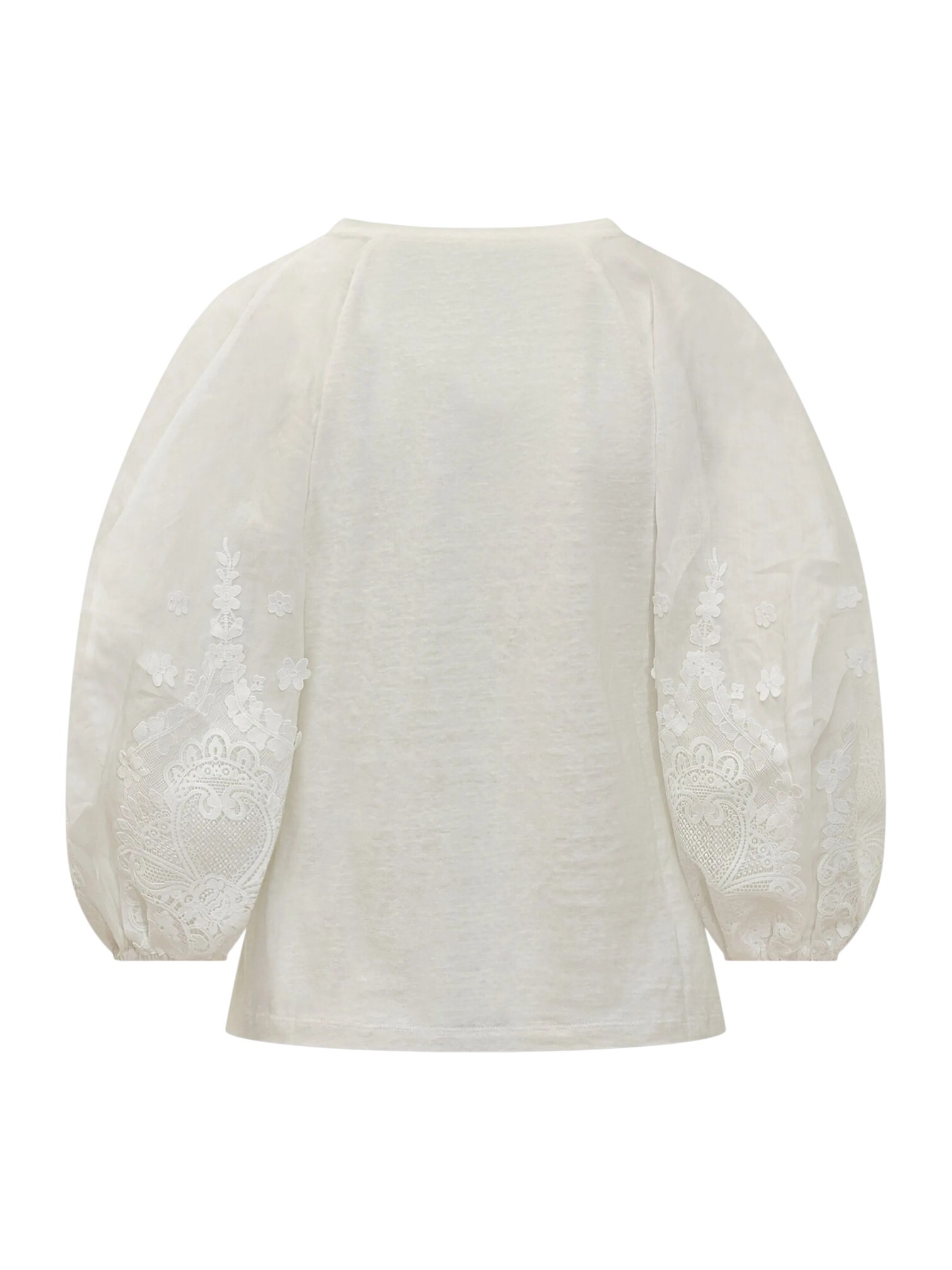 Блуза Zimmermann - выполненный из натурального льна для максимального комфорта. Модель отличается романтичным кроем с объемными рукавами-фонариками, украшенными изысканными кружевными вставками. Свободный силуэт и круглый вырез горловины создают непринужденный образ, а рукава три четверти подчеркивают утонченность. Идеальная вещь для создания стильного лука в стиле бохо-люкс.