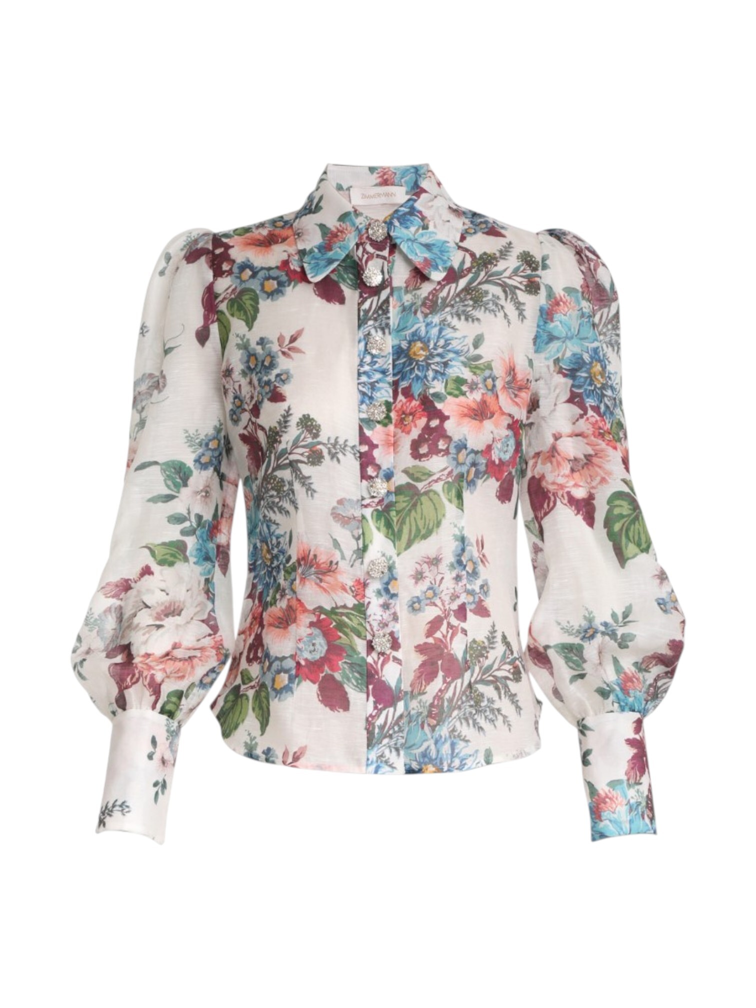 Блуза Zimmermann - романтичный шик в натуральных тканях. Блуза в цветочном принце воплощает фирменную эстетику бренда. Полуприталенный крой с отложным воротником подчеркивает фигуру, сохраняя легкость. Длинные объемные рукава, собранные на широкие манжеты, добавляют образу динамики и изящества. Особый шарм придают крупные пуговицы, декорированные кристаллами и стразами. Состав из натурального льна и шелка обеспечивает комфорт, струящуюся текстуру и практичность. Идеальная основа для женственного образа.