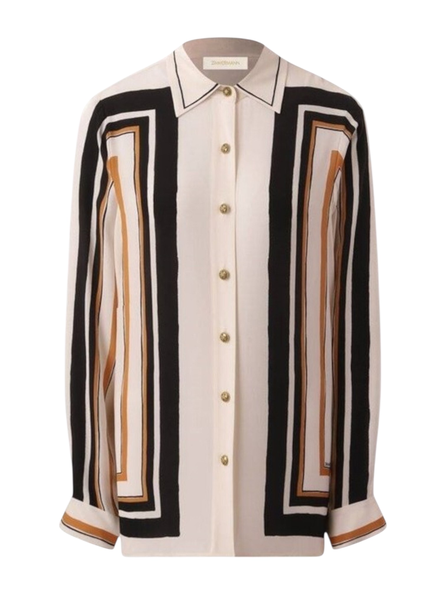 Блуза Zimmermann - cвободный силуэт из струящегося натурального шелка с графичной классической полоской создает эффект непринужденного шика. Эта вещь станет универсальным героем вашего гардероба: от пляжных прогулок до вечерних выходов. Графичный принт сочетает классику с современностью. Пуговицы по всей длине, а так же манжеты.