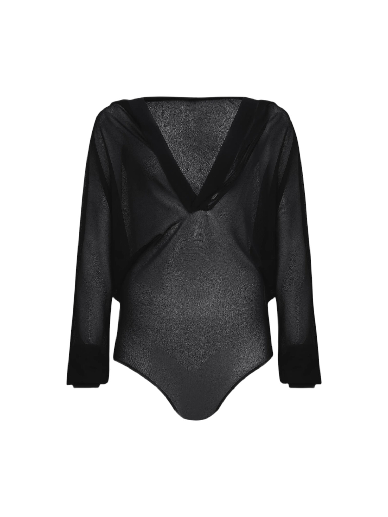 Боди Alaïa - не просто одежда, это архитектурный чертеж тела, переведенный в ткань. Глубокий вырез - это не просто декольте, а геометрический жест. Чёткая, дерзкая линия, которая вырезает пространство, притягивая взгляд к силуэту в целом, а не к частностям. Он говорит о смелости, лишённой вульгарности. Большой капюшон - не просто утилитарный элемент. Это драматичный акцент, добавляющий объём и таинственность. Он может обрамлять лицо как монашеский клобук или откидываться, создавая скульптурный силуэт от плеч. Это боди - для тех, кто понимает силу молчания кроя.