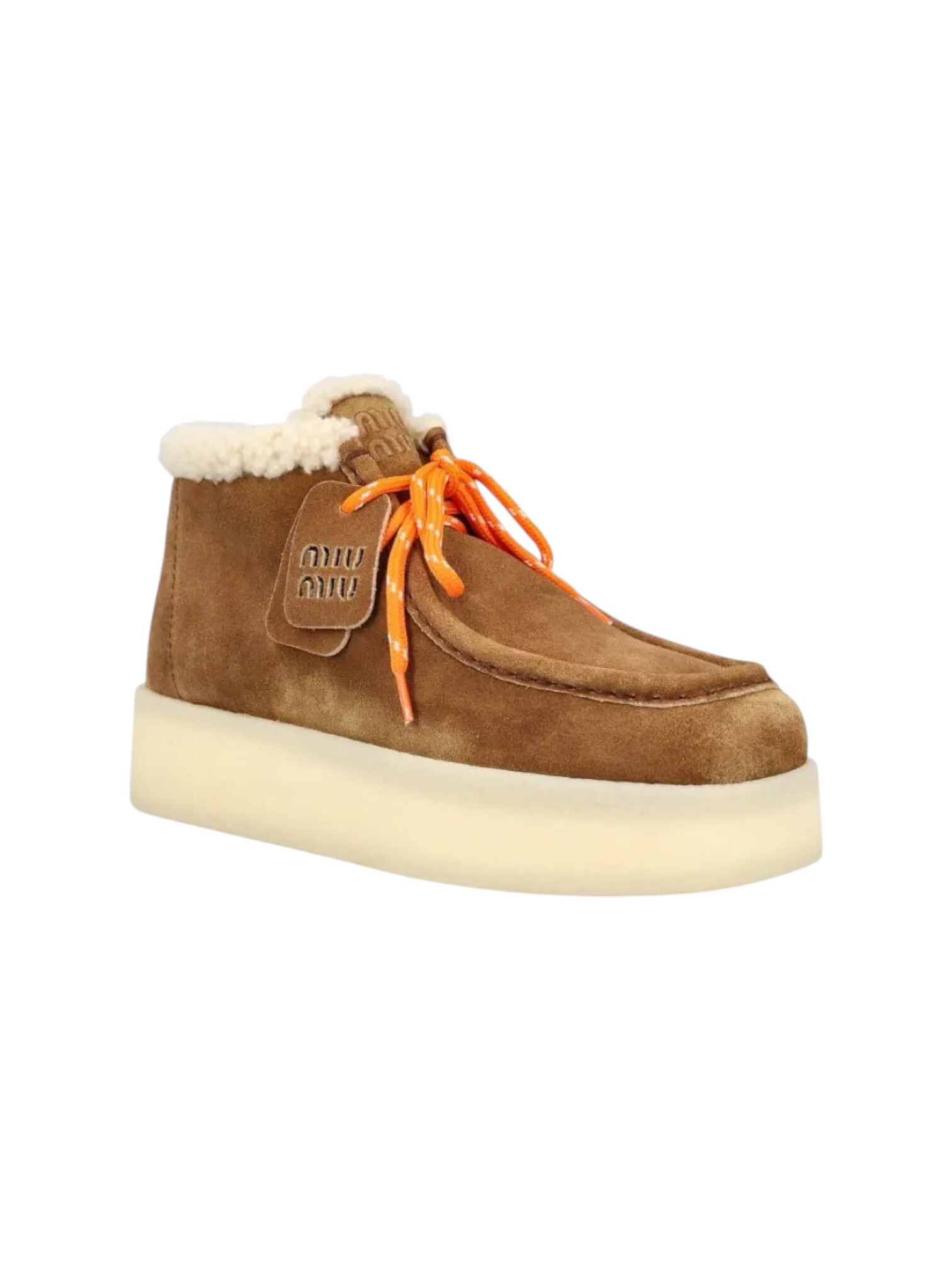 Ботинки Miu Miu - сочетают в себе дерзкий дизайн и фирменный комфорт бренда. Модель с характерным квадратным носком и шнуровкой контрастного оранжевого цвета создает яркий, запоминающийся образ. Резиновая подошва обеспечивает удобство и износостойкость для повседневной носки, а стелька из овчины дарит дополнительное тепло и комфорт. Фирменный логотип на язычке подчеркивает принадлежность к роскошной марке. Эти ботинки - идеальный выбор для создания смелого, но комфортного городского образа.