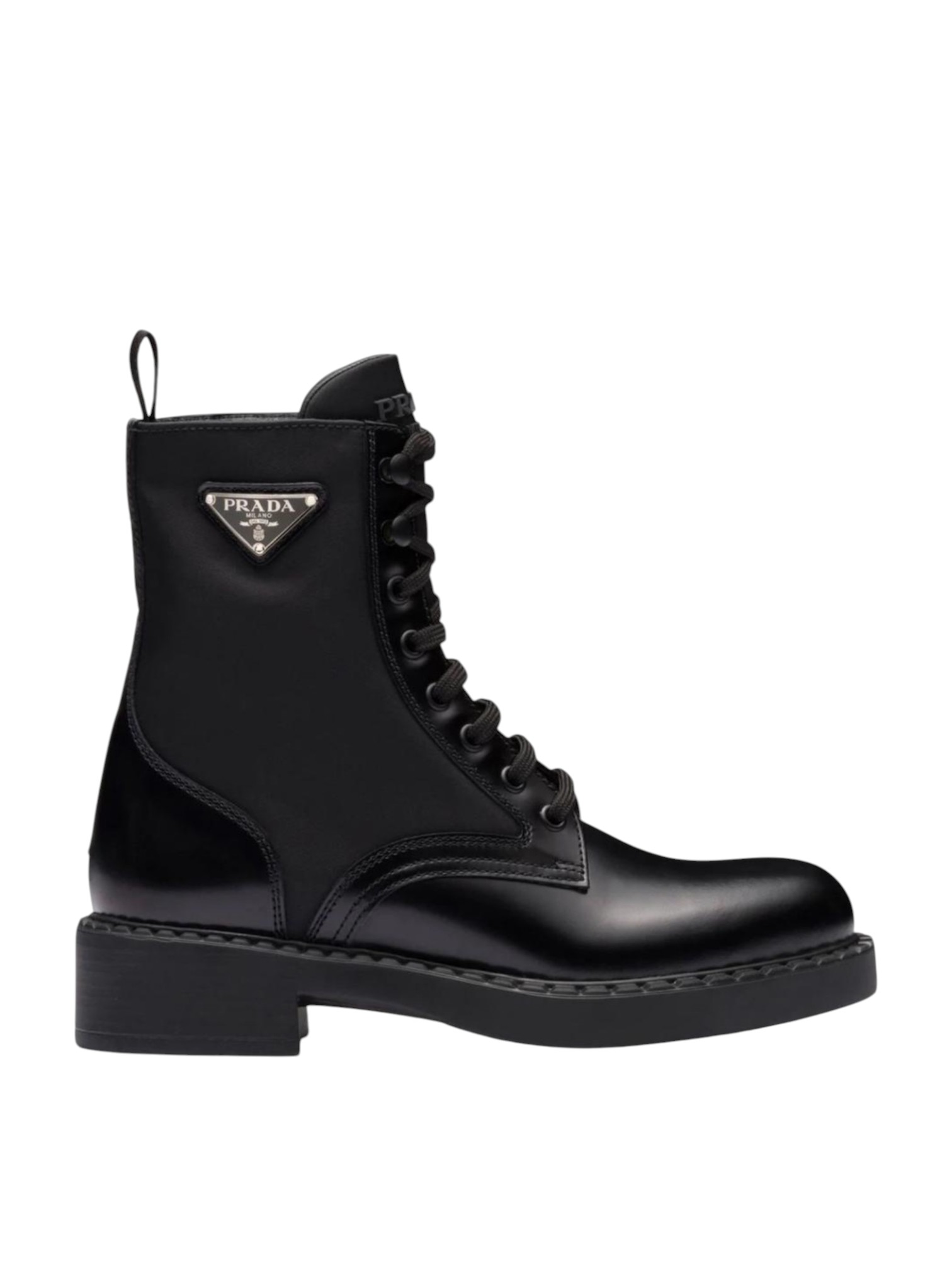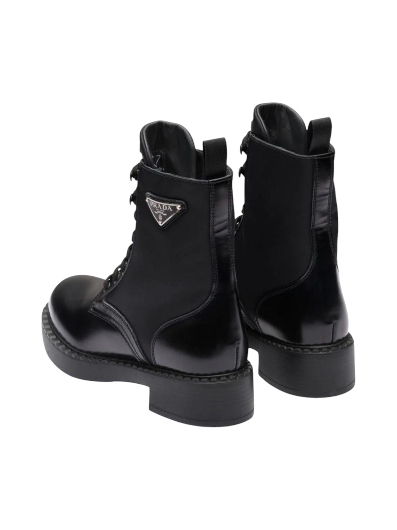 Ботинки Prada - это сочетание стиля и комфорта. Широкая подошва с подъемом обеспечивает удобство при ходьбе, а текстильные вставки добавляют легкость и воздухопроницаемость. Высокая модель выполнена из 100% телячьей кожи, что гарантирует долговечность и элегантный внешний вид. Безупречный баланс элегантности, комфорта и технологичного дизайна.