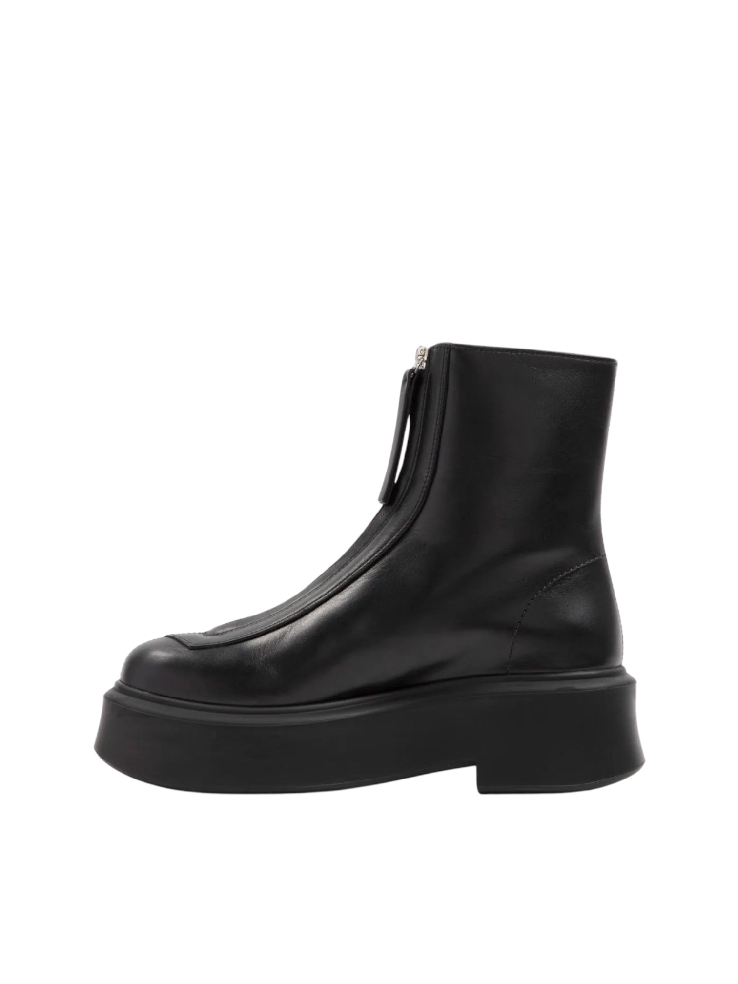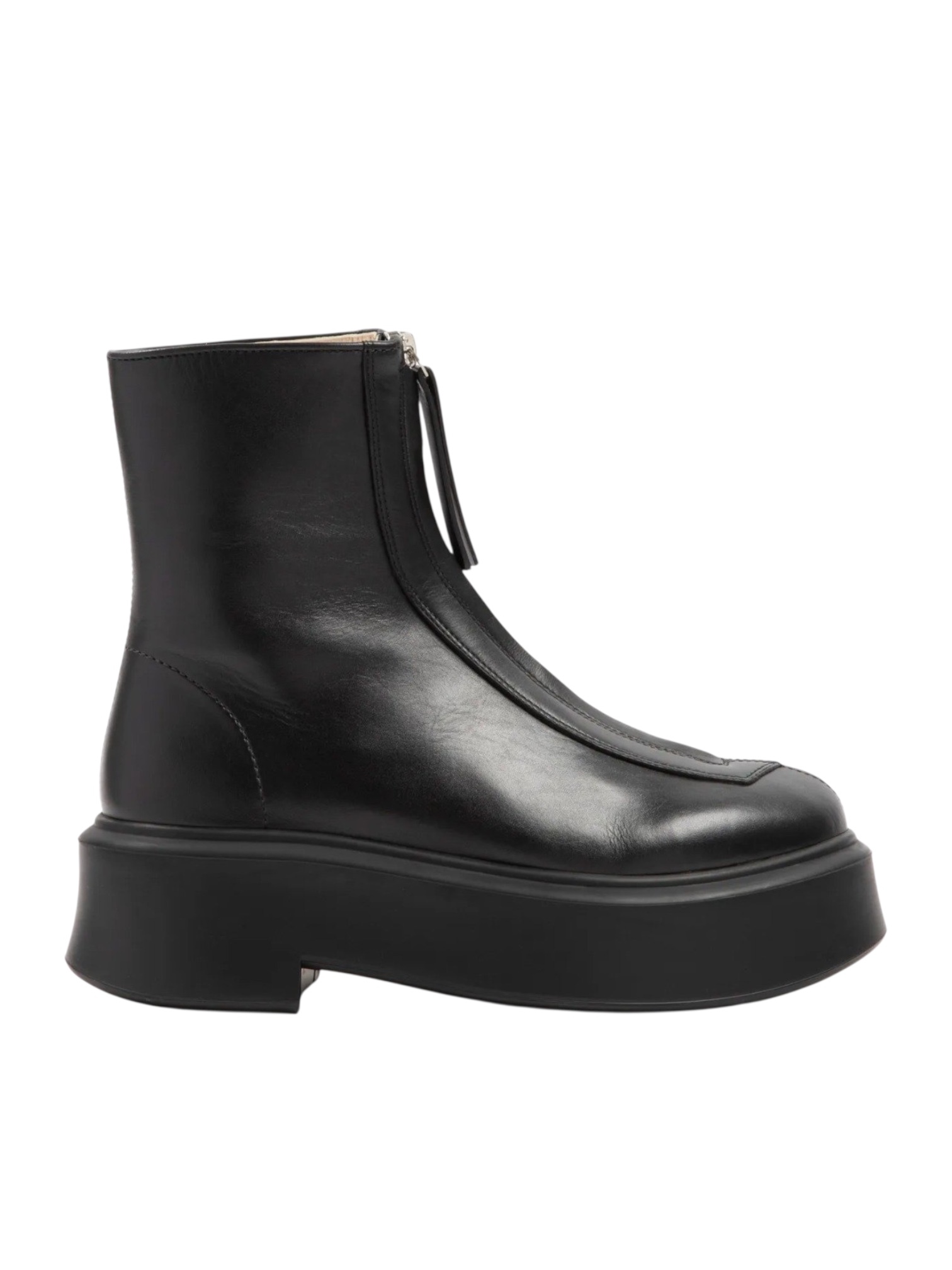 Ботинки The Row выполнены в стильном минималистичном дизайне. Модель расположена на платформе, что придает им современный и устойчивый силуэт. Потайная застежка на молнии спереди обеспечивает гладкий внешний вид и удобство при надевании и снятии обуви. Эти ботинки сочетают элегантность и практичность, идеально подходя для создания сдержанных и утонченных образов с акцентом на качество и стиль.