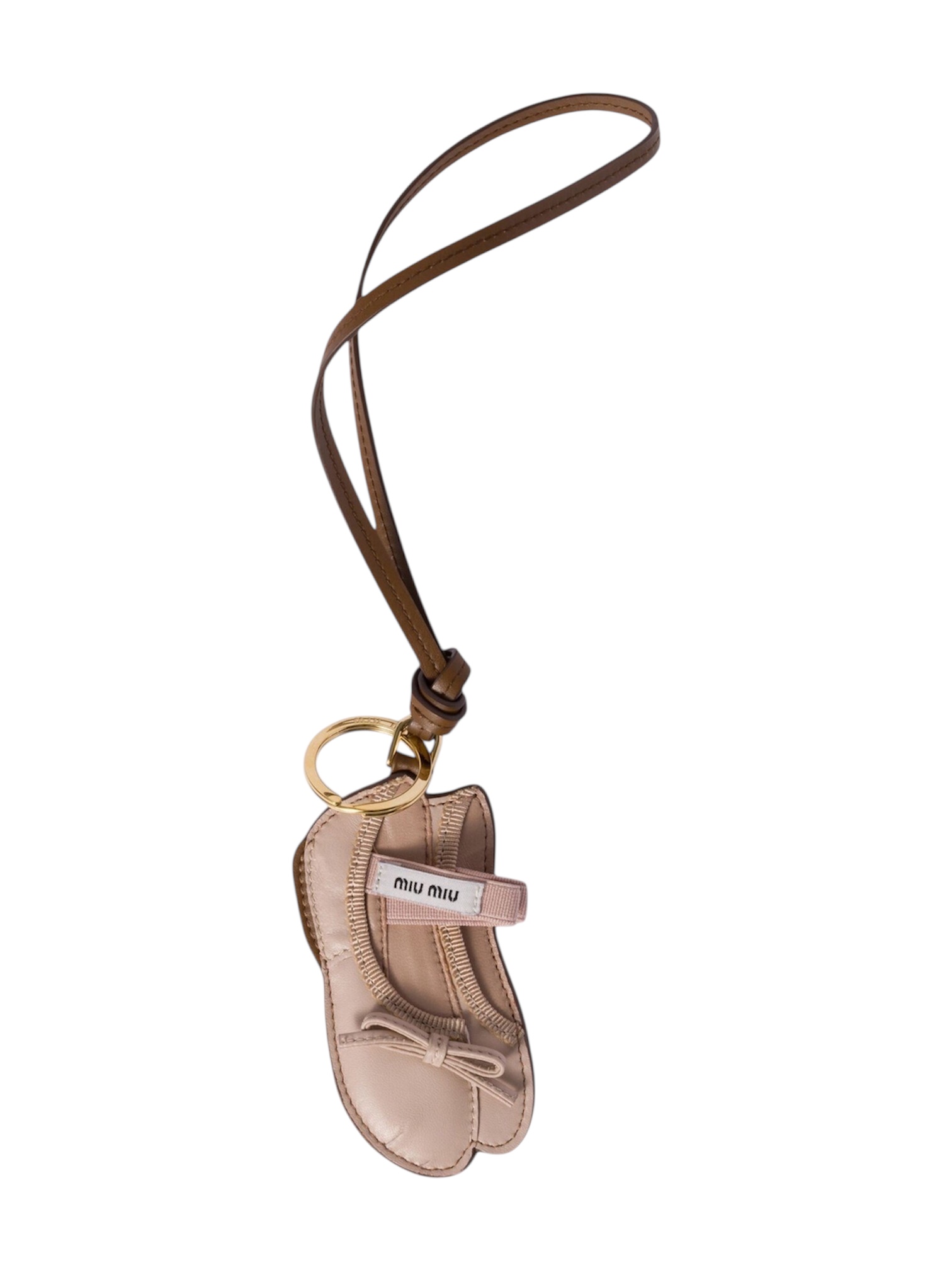 Брелок Miu Miu - в виде миниатюрной балетной туфельки, выполненный из нежной бежевой кожи. Модель сочетает в себе игривый шик и утонченную элегантность, характерные для ДНК бренда. Аппликация с логотипом Miu Miu и зеркальная бирка добавляют узнаваемости, а изящное кольцо для крепления делает аксессуар функциональным дополнением к сумкам, ключам или рюкзакам. Идеально для: повседневного использования, особых случаев и в качестве изысканного подарка, где важны внимание к деталям, игривость и неповторимый стиль.
