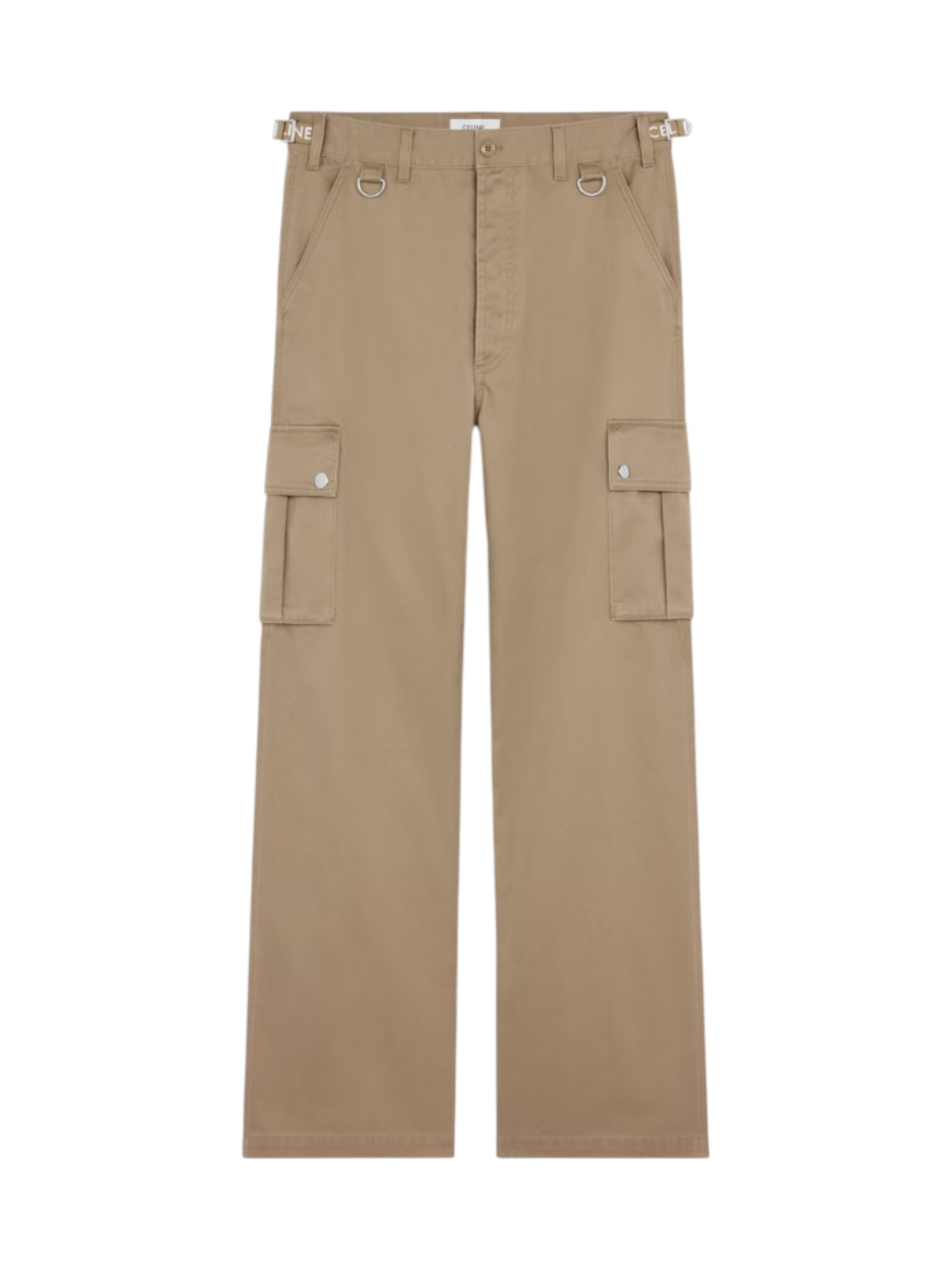 Брюки Celine - это заявление о вашем стиле. Бренд берет утилитарный силуэт и наполняет его парижским шиком, создавая вещь невероятной мощности. Классические два боковых кармана дополнены накладными карманами с клапанами на боковых швах, подчеркивая утилитарный характер модели и обеспечивая практичность. Застежка на молнию и пуговицу, а также металлическая пряжка гарантируют надежность и дополняют образ в индустриальном стиле. Эти брюки - идеальная основа для создания модных образов, от повседневных аутфитов с кроссовками до стильных комбинаций с рубашками и пиджаками.