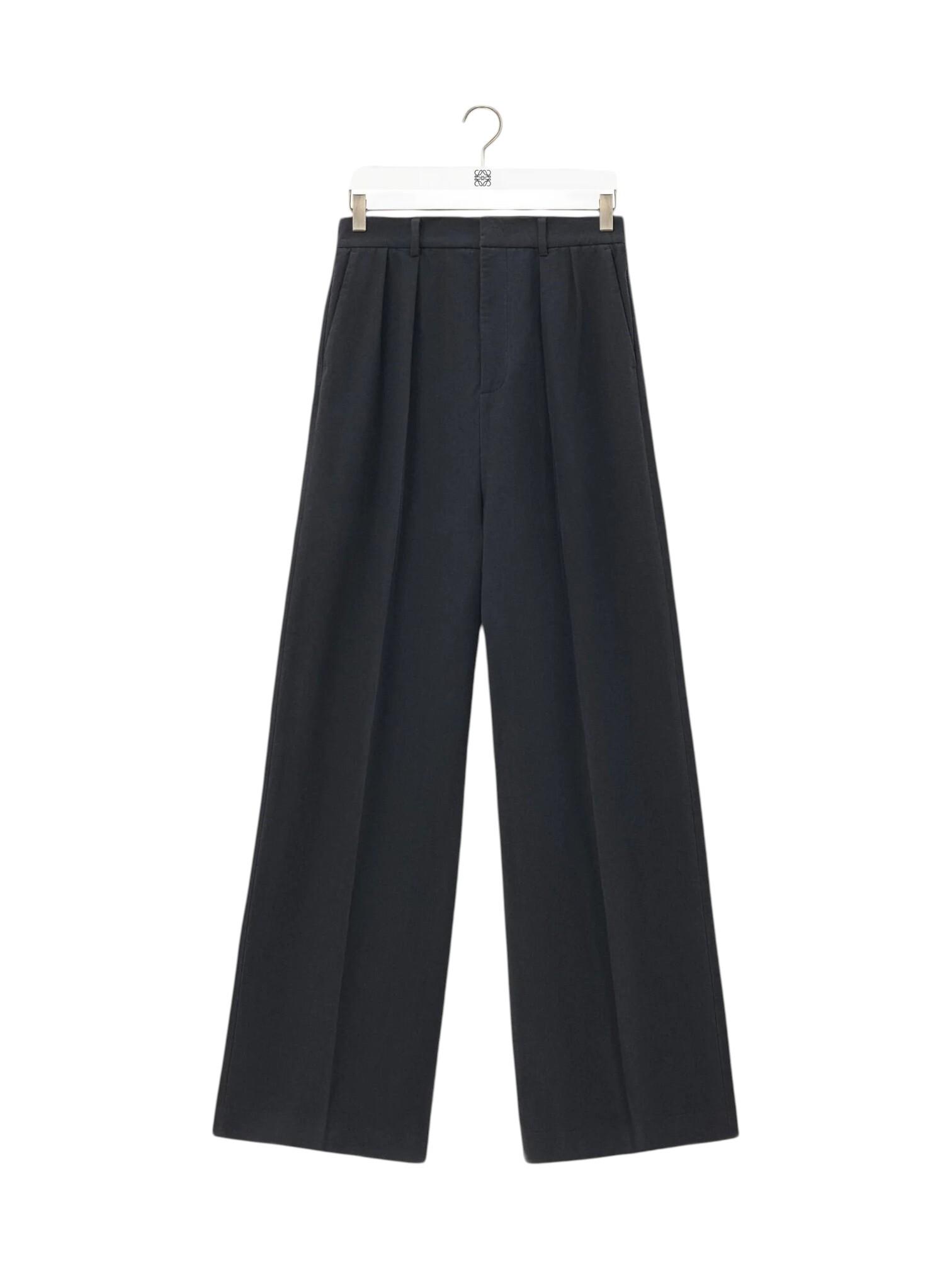 Брюки Loewe - широкие темно-антрацитового оттенка от культового испанского дома. Модель сшита из роскошного ворсистого хлопкового мольтона, который обеспечивает тактильный комфорт и безупречную посадку. Детали - изящные передние складки и четкие стрелки - подчеркивают портновское мастерство и отсылают к классической эстетике. Умеренная посадка на талии, функциональные боковые карманы и потайная застежка-молния создают сбалансированный силуэт, сочетающий строгость и современную легкость. Идеальная пара для тех, кто ценит сложный крой и вневременной стиль.