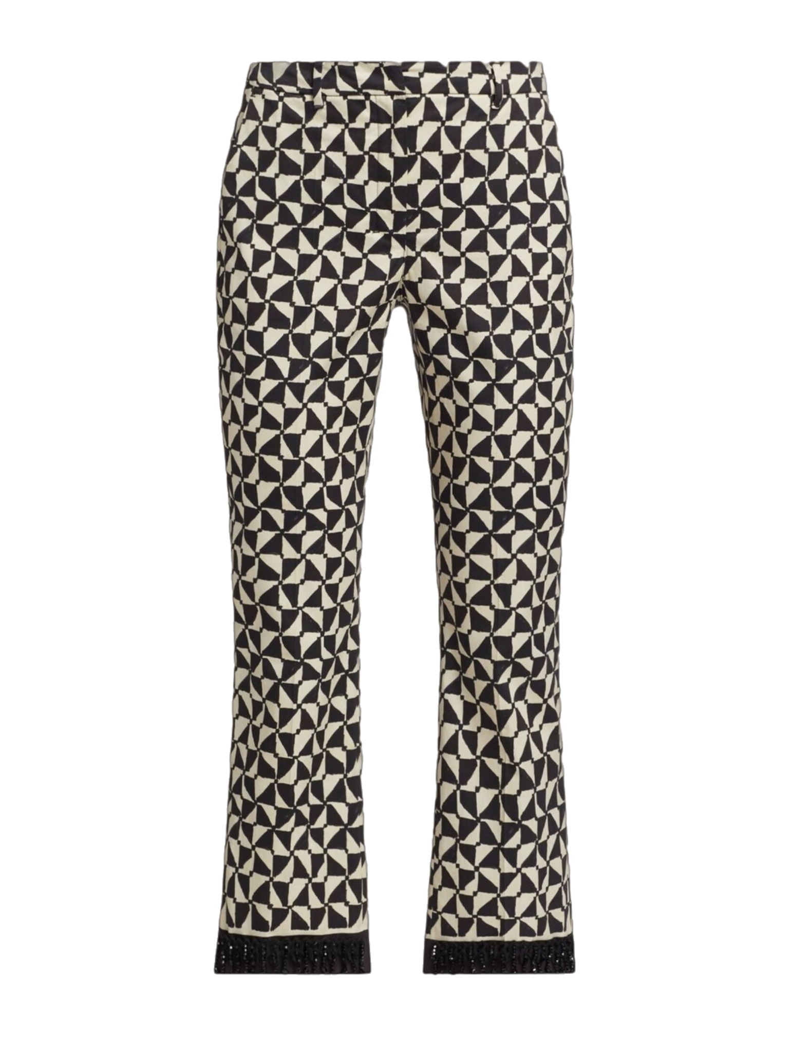 Брюки Max Mara - воплощение современной классики с нотками ретро-гламура. Прямой силуэт с аккуратными манжетами по низу создает строгий, но стильный образ, а контрастный узор из треугольников добавляет динамичный акцент. Геометрический принт – графичные треугольники в черно-бежевой гамме для трендового штриха. Max Mara Nereo – безупречное качество, сдержанная палитра и актуальные детали. Эти брюки – инвестиция в гардероб, где каждая деталь продумана до мелочей.