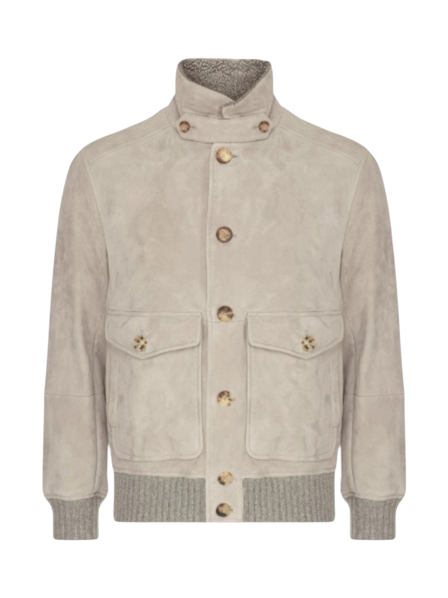 Дубленка Brunello Cucinelli - выполнена из высококачественного материала светло-бежевого оттенка. Модель отличается минималистичным, но элегантным дизайном с акцентом на премиальные материалы и безупречный крой. Внутренняя отделка из мягкой овчины обеспечивает тепло и комфорт в холодное время года. Дублёнка имеет высокий воротник с дополнительной застёжкой, крупные накладные карманы с клапанами и застёгивается на пуговицы. Манжеты и нижняя кромка выполнены из эластичного трикотажа в тон, что придаёт модели спортивный акцент и обеспечивает идеальную посадку.