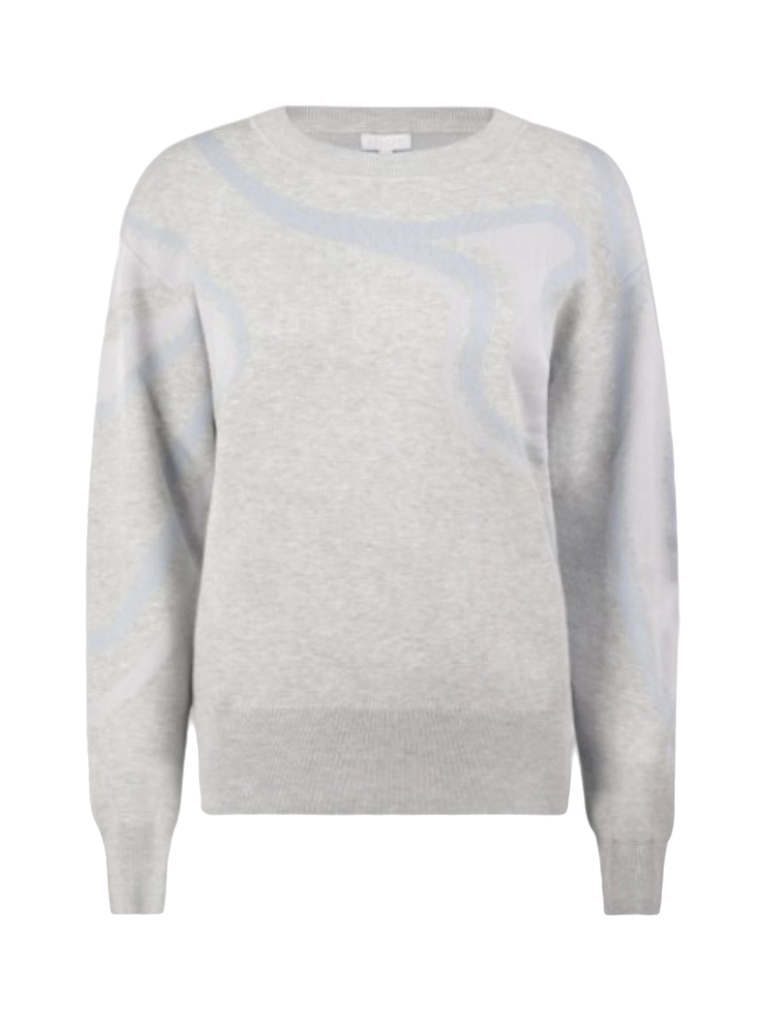Джемпер Escada - выполнен из мягкого трикотажа светло-серого цвета с ненавязчивым абстрактным узором в оттенках голубого и белого. Модель имеет классический прямой крой, округлый вырез горловины и длинные рукава. Эластичные манжеты и нижняя кромка обеспечивают комфортную посадку и сохраняют форму изделия. Универсальный и элегантный, этот джемпер станет отличной базой для повседневного или делового гардероба.