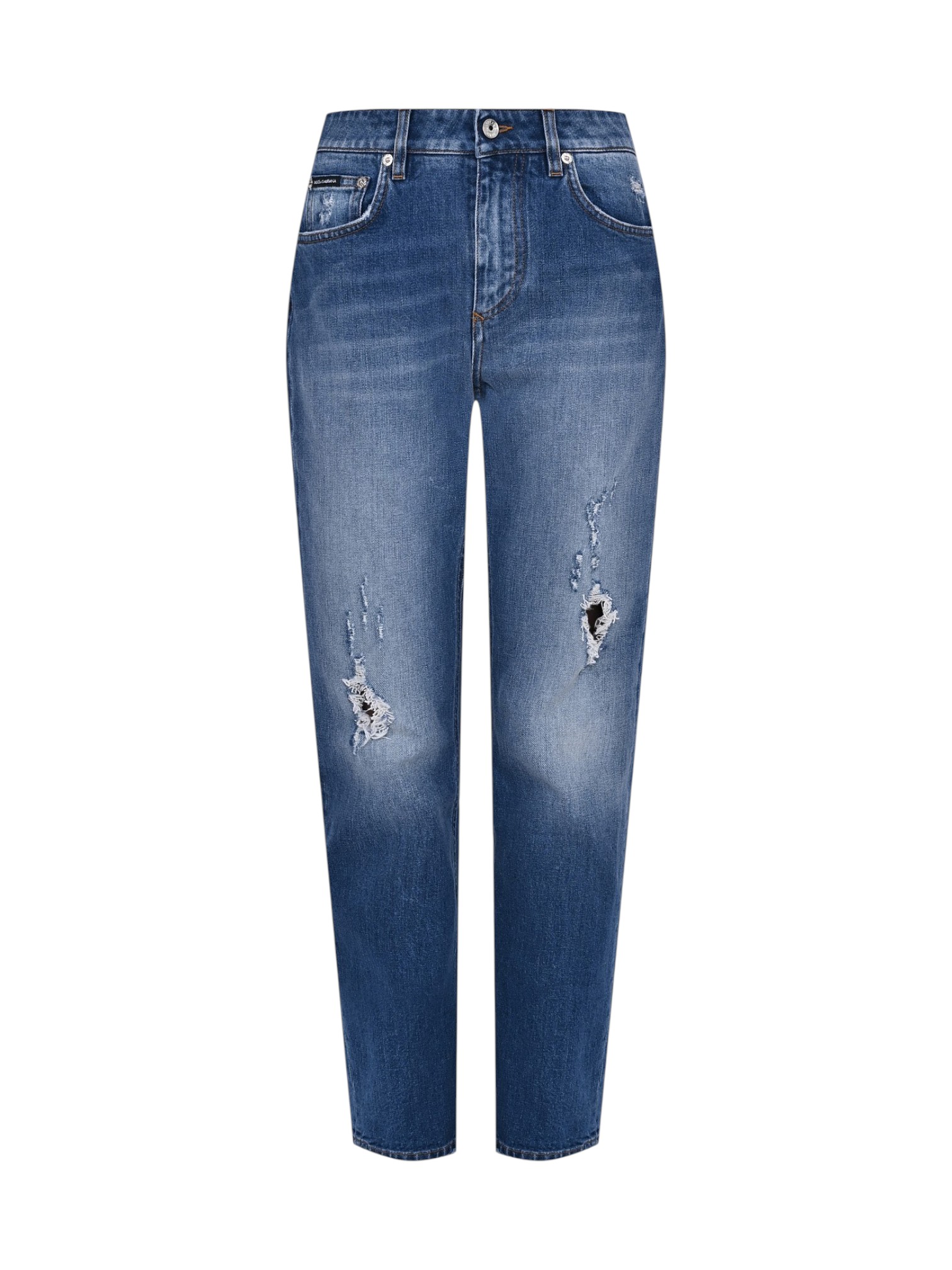 Джинсы Dolce&Gabbana - идеальный баланс между классическим денимом и уличной дерзостью. Выполненные из хлопка с добавлением эластана, они сидят по фигуре мягко, не сковывая движений, и дарят комфорт на весь день. Классический пятикарманный крой и шлевки для ремня отвечают за функциональность, а центральная застёжка на пуговицу и молнию - за удобство. Рваные джинсы - это манифест свободы. А с подписью Dolce&Gabbana - ещё и безупречного вкуса.