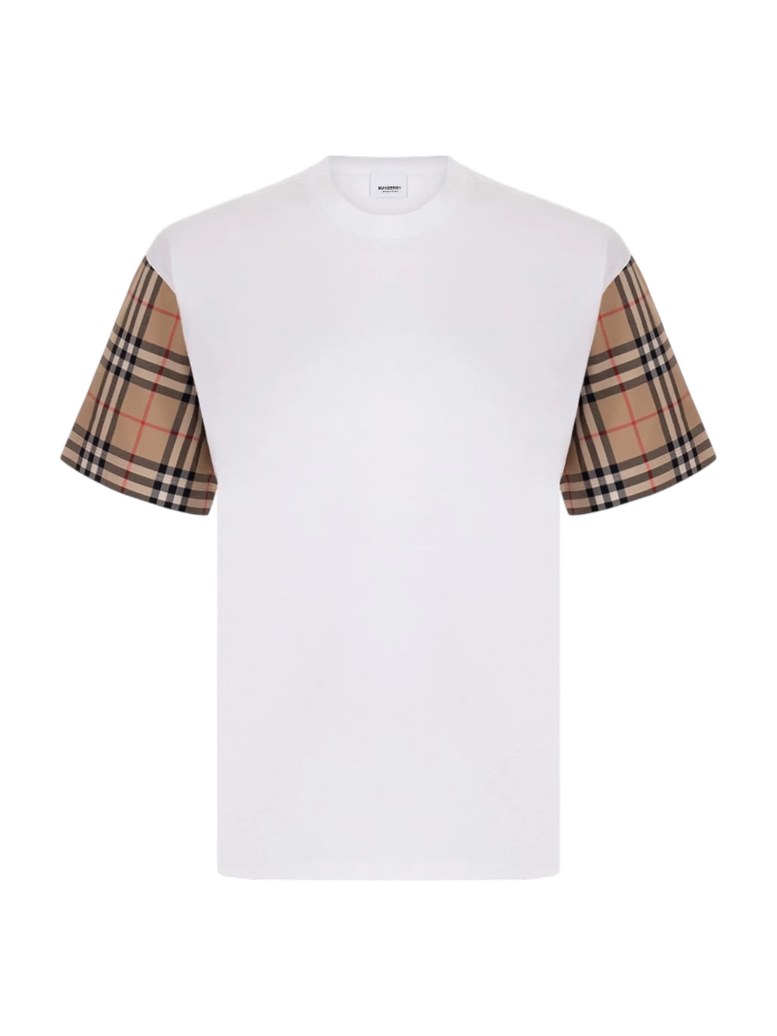Футболка Burberry - это свежий взгляд на уличную классику, где комфорт встречается с узнаваемым британским стилем. Свободный крой и спущенная линия плеч создают модный, непринуждённый силуэт, который не сковывает движений и подходит для любого типа фигуры. Круглый вырез мягко обрамляет шею, а главная деталь - клетчатый мотив, расположенный на рукавах, - добавляет образу ту самую «изюминку», по которой Burberry узнают во всём мире. Это та футболка, которую вы будете носить всё лето, а потом и осенью - под пиджаком или кардиганом.