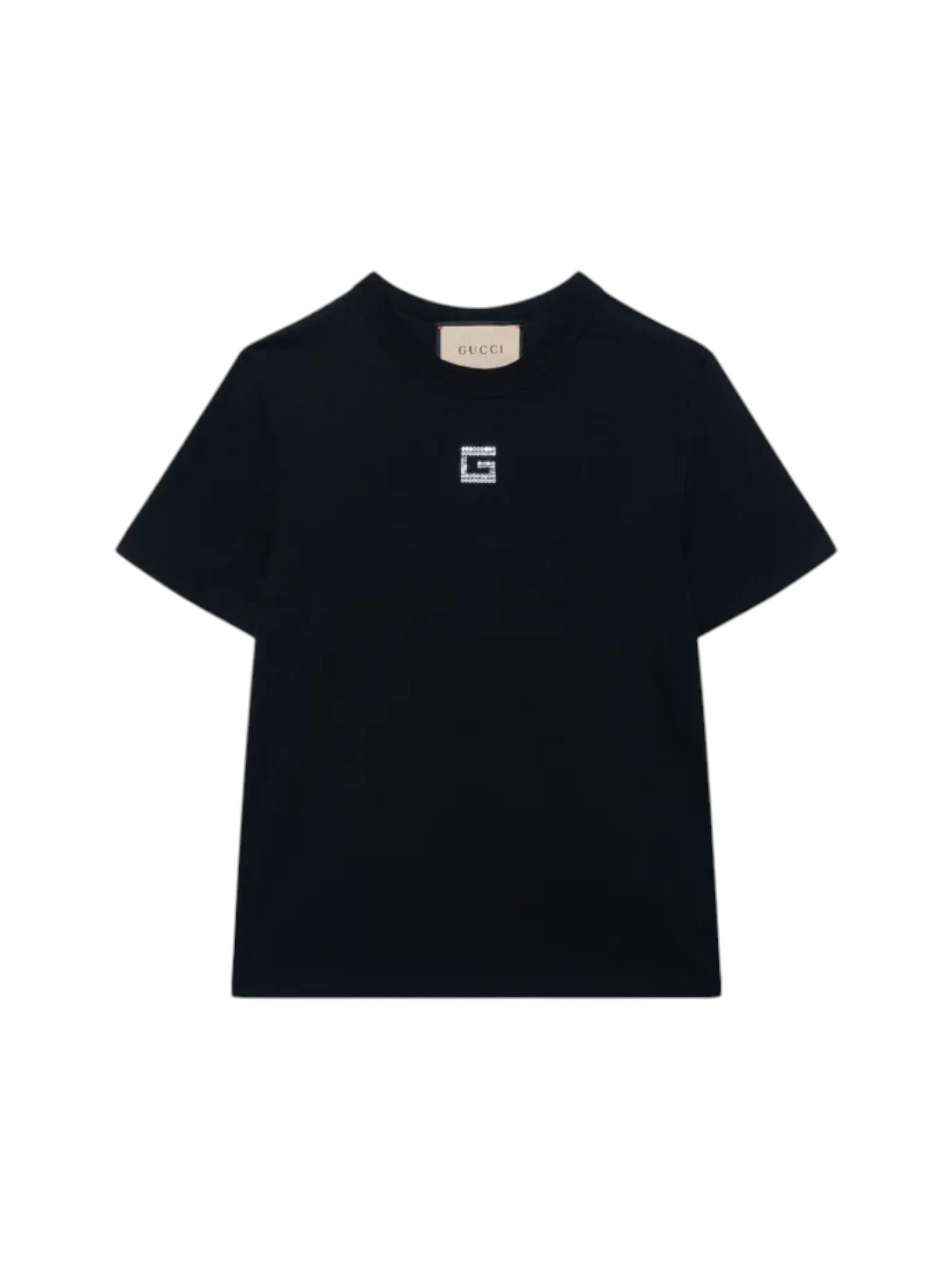 Футболка Gucci - из мягкого хлопкового джерси станет основой вашего стильного образа. Центральным элементом дизайна является культовая монограмма Дома - логотип G, выполненный в виде объемной аппликации и украшенный множеством сверкающих стразов. Эта деталь мгновенно делает образ узнаваемым и добавляет ему ноту роскоши. Футболка имеет универсальный крой: классический круглый вырез, короткие рукава и прямой низ. Такая модель легко комбинируется с джинсами, блейзерами, кожаными куртками и юбками, подходя как для повседневной носки, так и для создания более смелых вечерних луков.