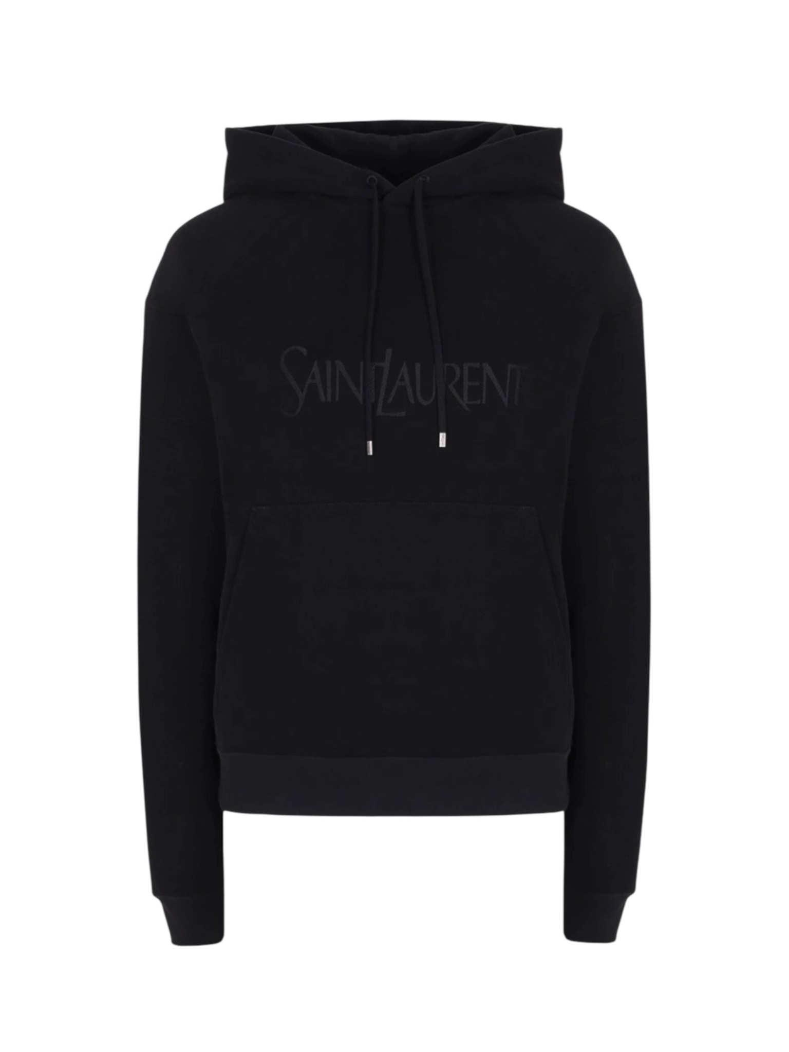 Худи Saint Laurent - максимальный комфорт и безупречный стиль в черном худи-оверсайз от SAINT LAURENT. Модель из мягкого хлопка имеет свободный крой со спущенной линией плеча и длинными рукавами. Эластичные манжеты и пояс дарят идеальное облегание. Удобный карман-кенгуру и регулируемый капюшон. Декорировано вышитым логотипом бренда спереди.