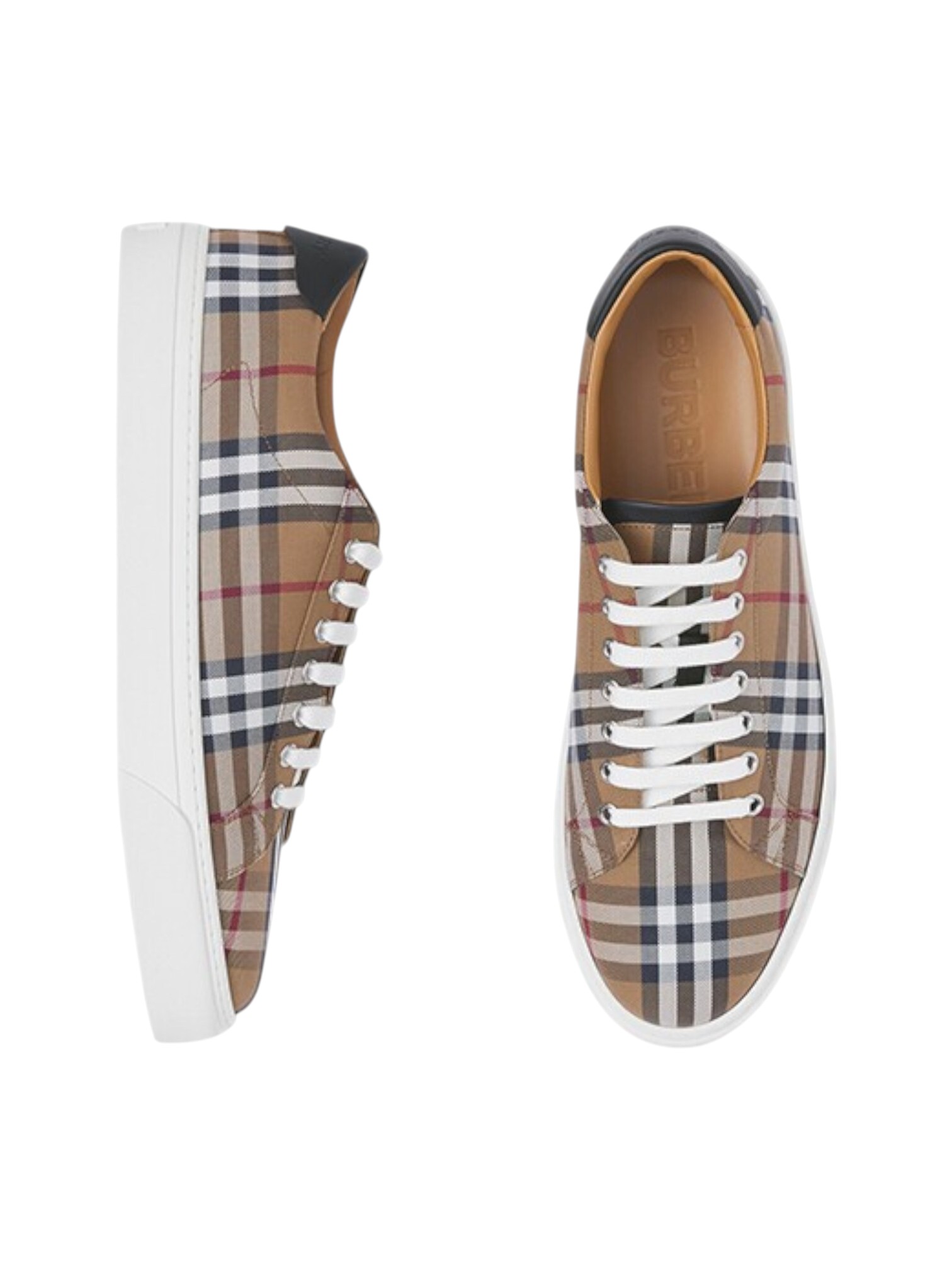 Кеды Burberry - выполнены в фирменном стиле бренда. Верх модели украшен легендарным клетчатым принтом Vintage Check в бежево-коричневой гамме с акцентами красного, синего и белого. Контрастная белая шнуровка и массивная резиновая подошва подчеркивают современный силуэт пары. На заднике - кожаная вставка глубокого темно-синего оттенка для дополнительного акцента. Эти кеды сочетают в себе повседневный комфорт и узнаваемую британскую эстетику.