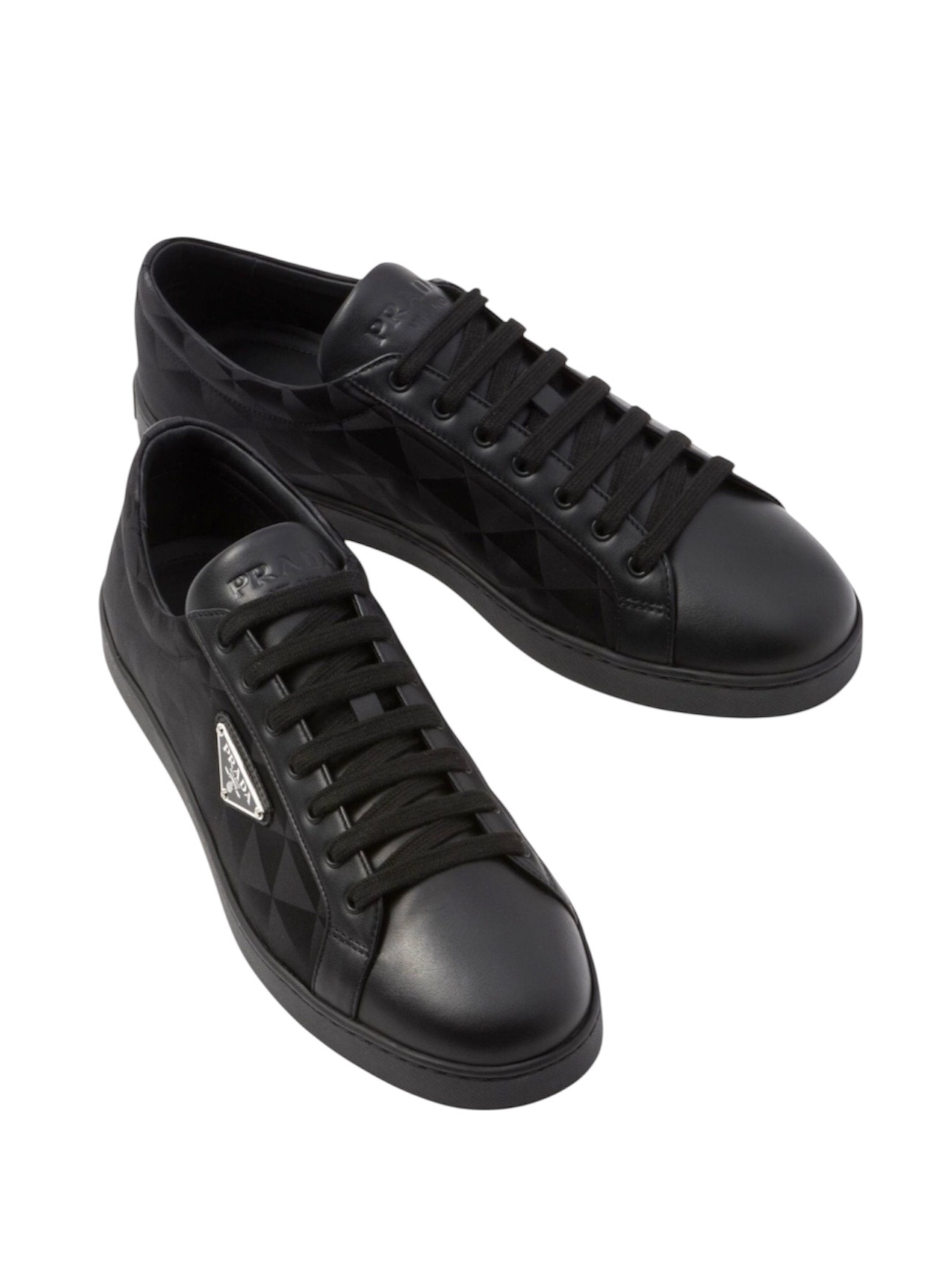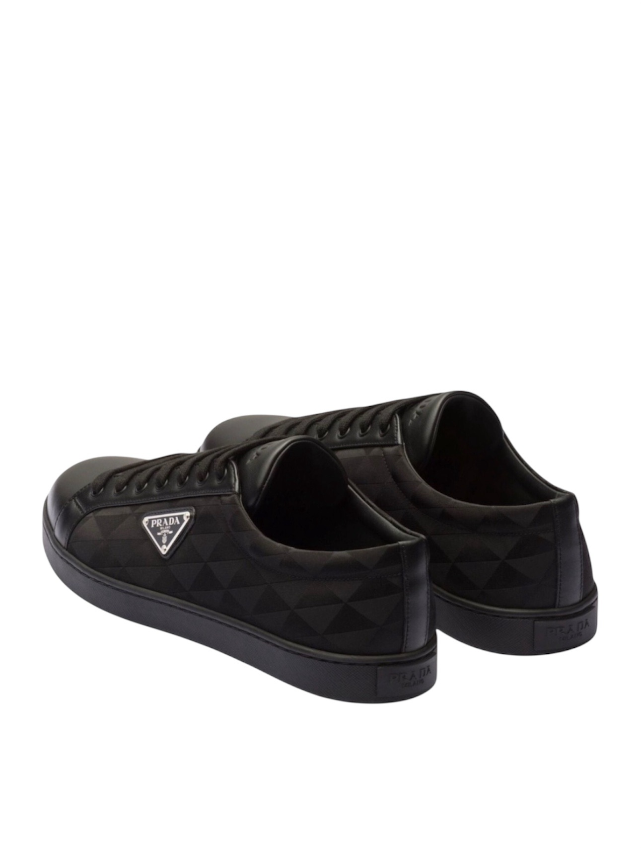 Кеды Prada - воплощающие гармонию классического дизайна и современных трендов. Модель выполнена из черной кожи премиального качества с геометрическим принтом, добавляющим визуальную глубину и сложность. Эмалевый треугольный логотип, узнаваемый символ бренда, подчеркивает статусность. Круглый носок и шнуровка спереди обеспечивают идеальную посадку и комфорт, а плоская резиновая подошва гарантирует устойчивость. Фирменная стелька завершает образ, отражая безупречное качество и внимание к деталям. Идеально для: городских прогулок, деловых встреч и повседневной носки, где важны наследие бренда, комфорт и итальянская роскошь.
