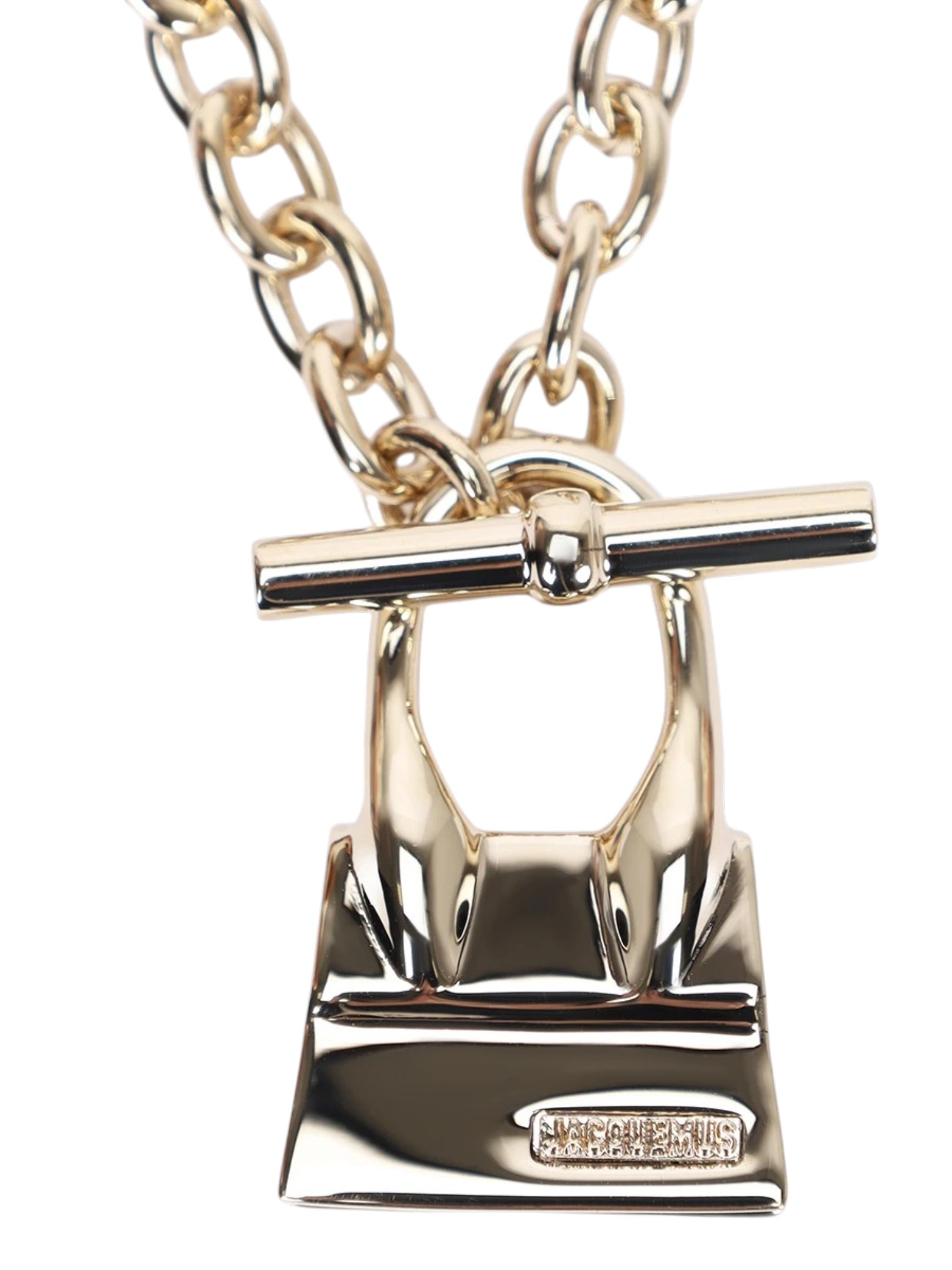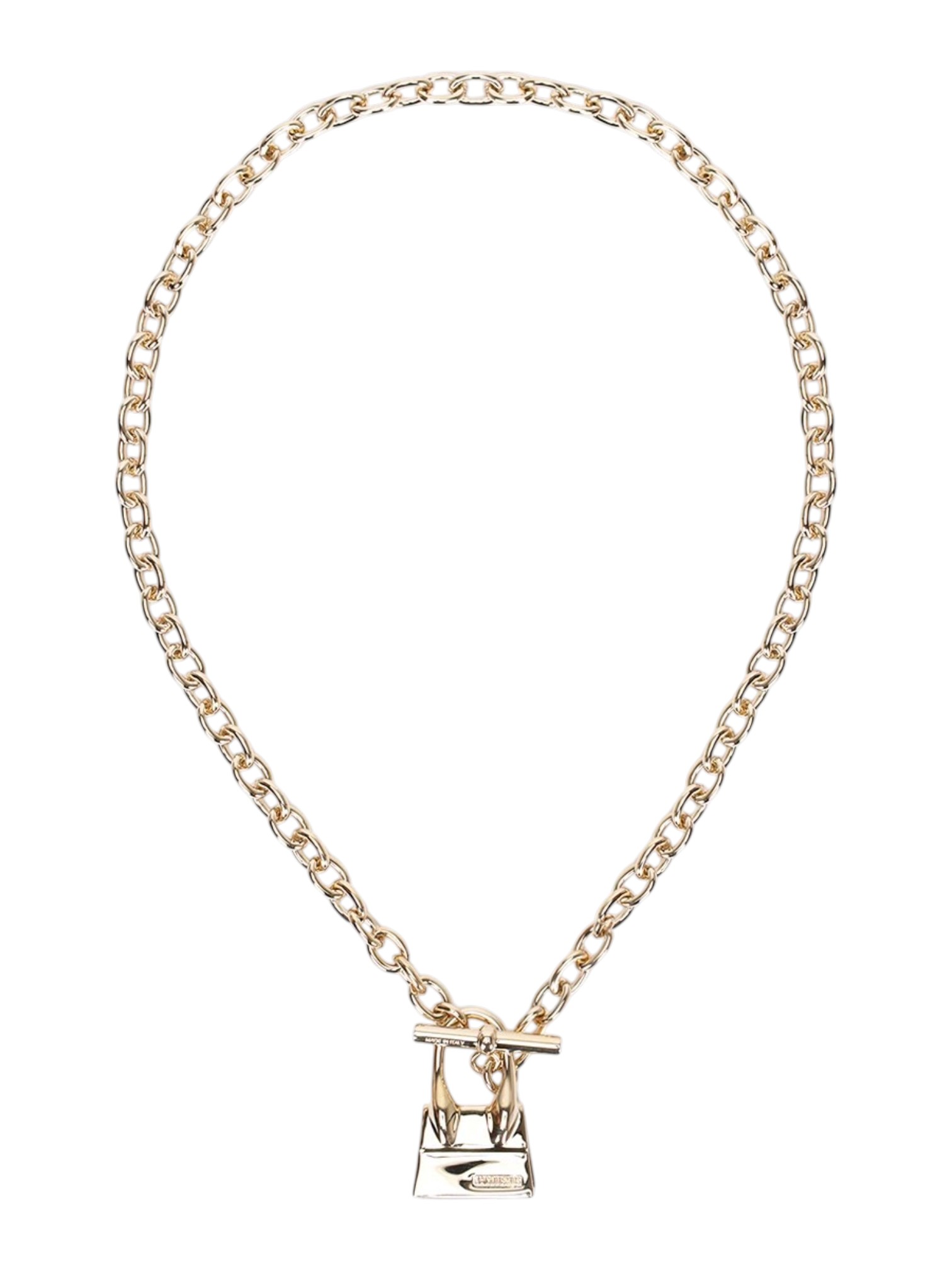 Колье Jacquemus - это украшение, которое стирает грань между аксессуаром и объектом искусства. Крупные, почти брутальные звенья цепочки создают графичный, объёмный силуэт, который сразу приковывает взгляд. Но главная изюминка - подвеска в виде миниатюрной сумки, знакомого символа бренда. Она словно игрушечная, но выполненная из того же качественного металла, что и цепочка. Это украшение для тех, кто ценит дизайн, юмор и умеет удивлять.