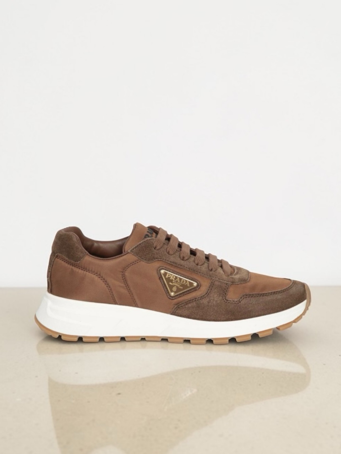 Кроссовки PRADA — это стильное решение для современных мужчин. Модель выполнена из замши и текстиля коричневого цвета. Дизайнеры бренда уделили особое внимание деталям: дизайн со вставками, нашивка с логотипом на язычке, треугольный эмалированный логотип, тональная строчка, округлый носок и шнуровка спереди создают эффект завершенности образа. Внутри кроссовка находится кожаная стелька с фирменным тиснением, а резиновая подошва обеспечивает комфорт при ходьбе.
