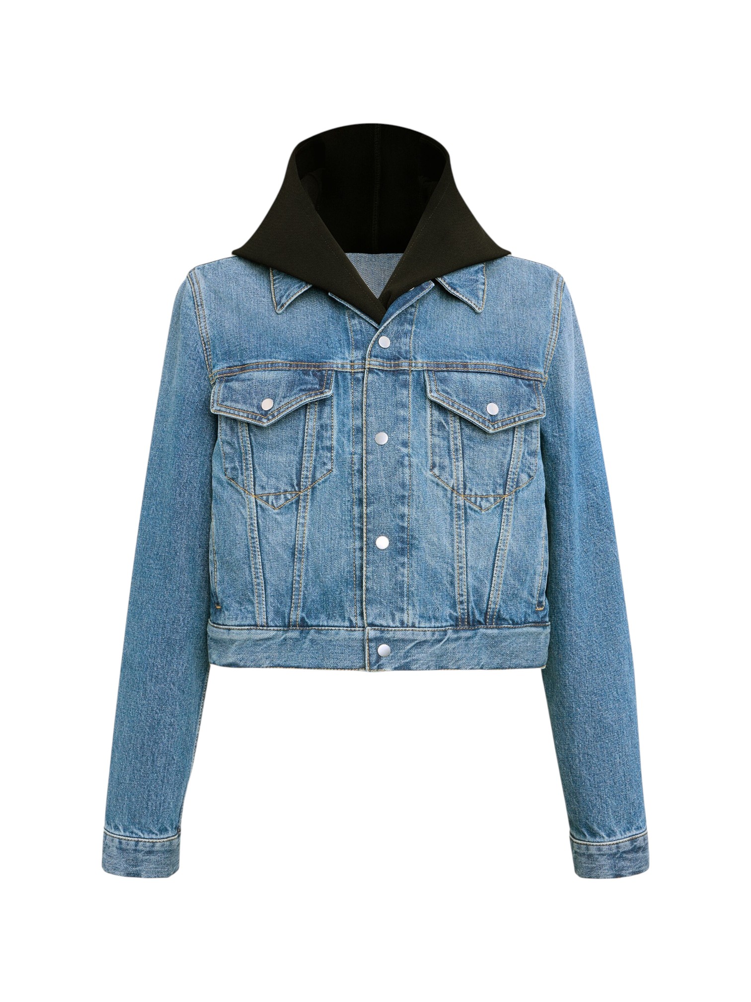 Куртка джинсовая Alaïa - переосмысливает классический предмет гардероба через призму фирменного скульптурного подхода бренда. Модель свободного кроя с капюшоном и контрастной прострочкой создает выразительный, архитектурный силуэт, который становится главным акцентом образа. Идеальный выбор для городских прогулок, путешествий и повседневной носки. Легко сочетается с платьями, юбками, брюками и джинсами.