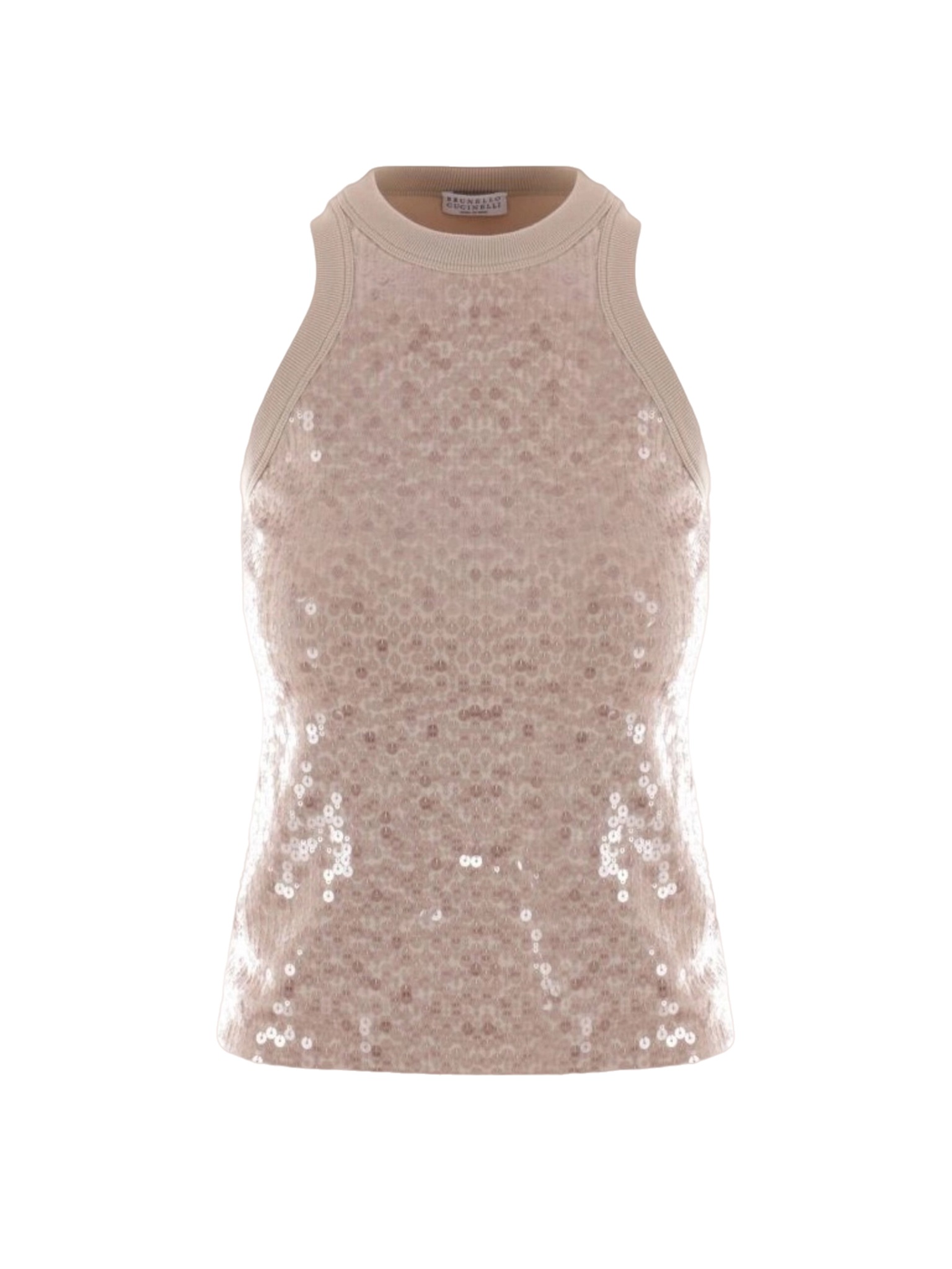 Майка Brunello Cucinelli - искусно связанная из высококачественной легкой пряжи, майка имеет изысканную текстуру, украшенную  деликатными блестками, что придает  блеск и женственность. Классический дизайн с круглым вырезом и без рукавов идеально подходит для многослойных образов или для ношения в теплую погоду. Эта майка сочетает  в себе комфорт и изысканный стиль, характерные для Brunello Cucinelli, и станет прекрасным дополнением к гардеробу.