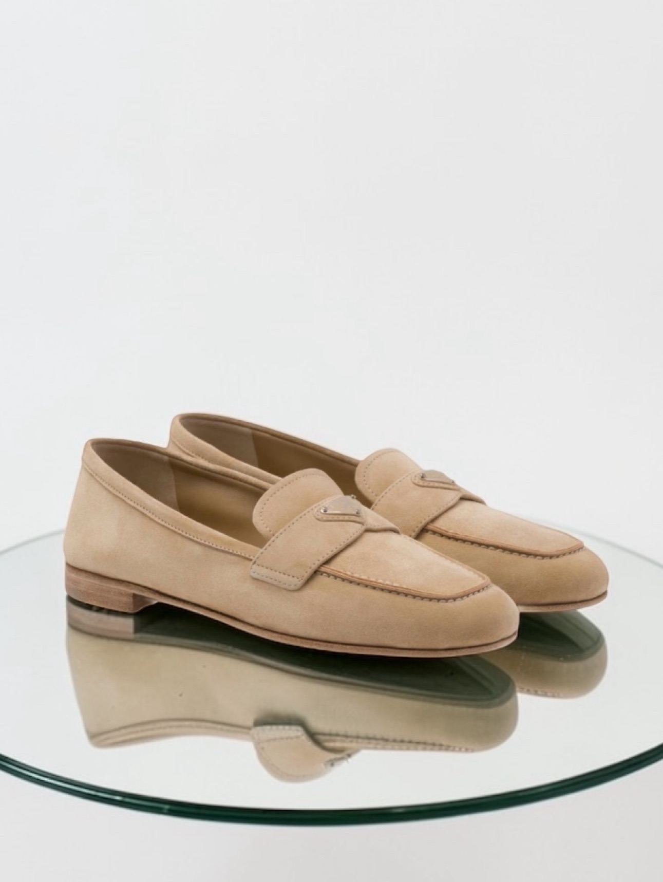 Лоферы Prada из замши с фирменным металлическим треугольником на мыске — это стильное и элегантное дополнение к любому гардеробу. Замша придаёт обуви мягкость и текстурированность, а металлический акцент с логотипом добавляет нотку роскоши и узнаваемости. Круглый носок обеспечивает комфорт и удобство при носке, а также способствует более расслабленному стилю. Печатный логотип на внутренней стороне обуви подчеркивает качество и внимание к деталям, что является характерной чертой бренда.