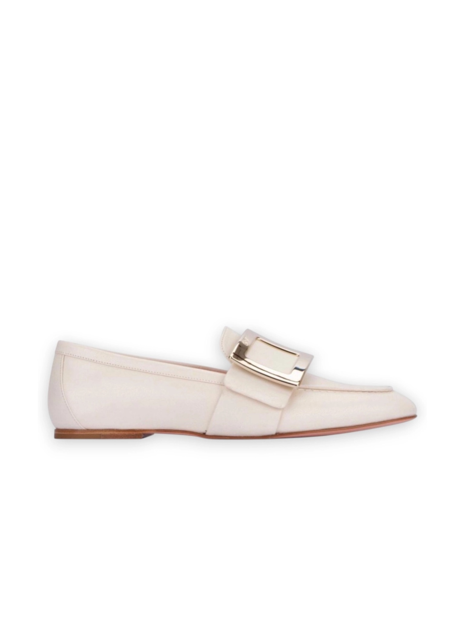Мокасины Roger Vivier - из мягкой кожи в элегантном светло-белом оттенке. Модель имеет заострённый носок и фирменную акцентную пряжку металлического оттенка на верхней части, что придаёт обуви утончённый и стильный вид. Плоская подошва и аккуратный силуэт делают эти мокасины универсальным выбором для повседневных и деловых образов.