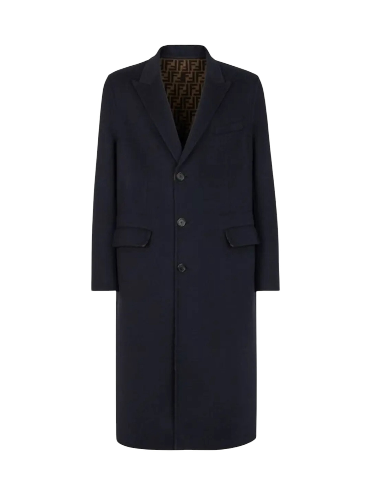Пальто Fendi - классика с современным акцентом, в котором традиционный крой сочетается с современной деталью. Модель с длинными рукавами и узнаваемым воротником с отворотом застегивается на пуговицы. V-образный вырез добавляет образу элегантной строгости и визуально вытягивает силуэт. Практичные боковые карманы завершают функциональный и лаконичный дизайн. Это пальто - вневременная инвестиция, отражающая безупречное качество и сдержанную роскошь итальянского Дома.
