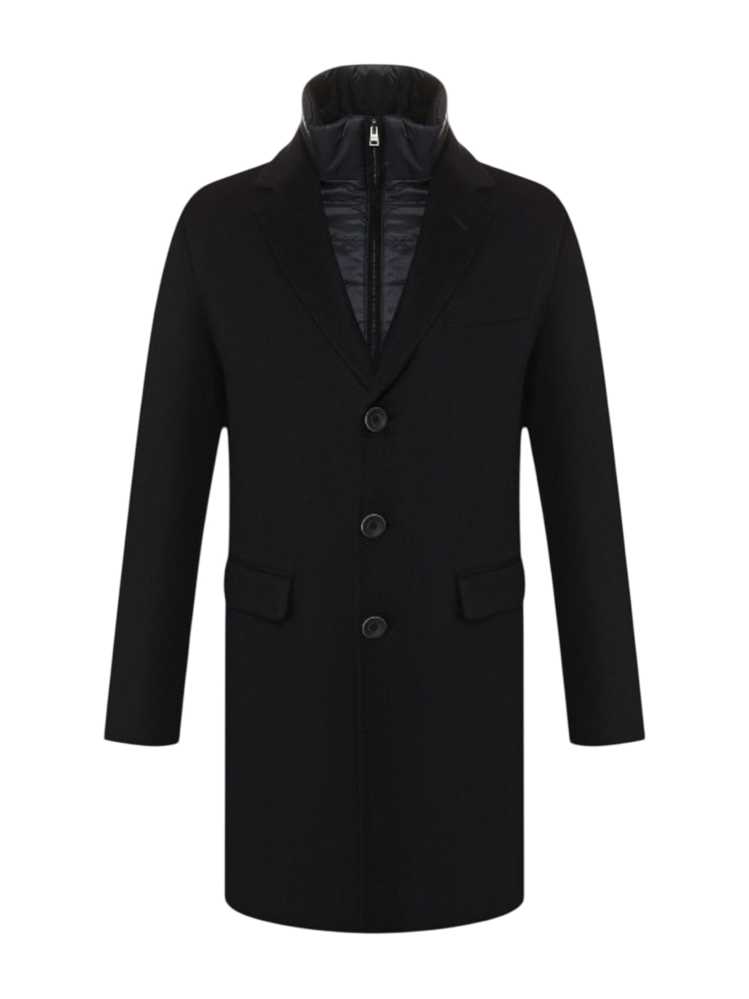 Пальто Herno - это безупречный комфорт и итальянское мастерство. Это черное пальто сшито из исключительно мягкой смесовой шерсти с добавлением кашемира, дарящей тепло и благородную фактуру. Приталенный крой подчеркивает силуэт, сохраняя элегантную легкость. Ключевая особенность - съемная нагрудная часть на молнии, позволяющая мгновенно трансформировать образ от классического до более лаконичного. Функциональные прорезные карманы с клапанами, отложной воротник и лацканы завершают безупречный дизайн. Основная застежка на пуговицы обеспечивает надежность. Идеальное сочетание традиционного качества HERNO, инновационной многофункциональности и вневременной серой палитры для мужчин, ценящих подлинный стиль и комфорт в любой ситуации.