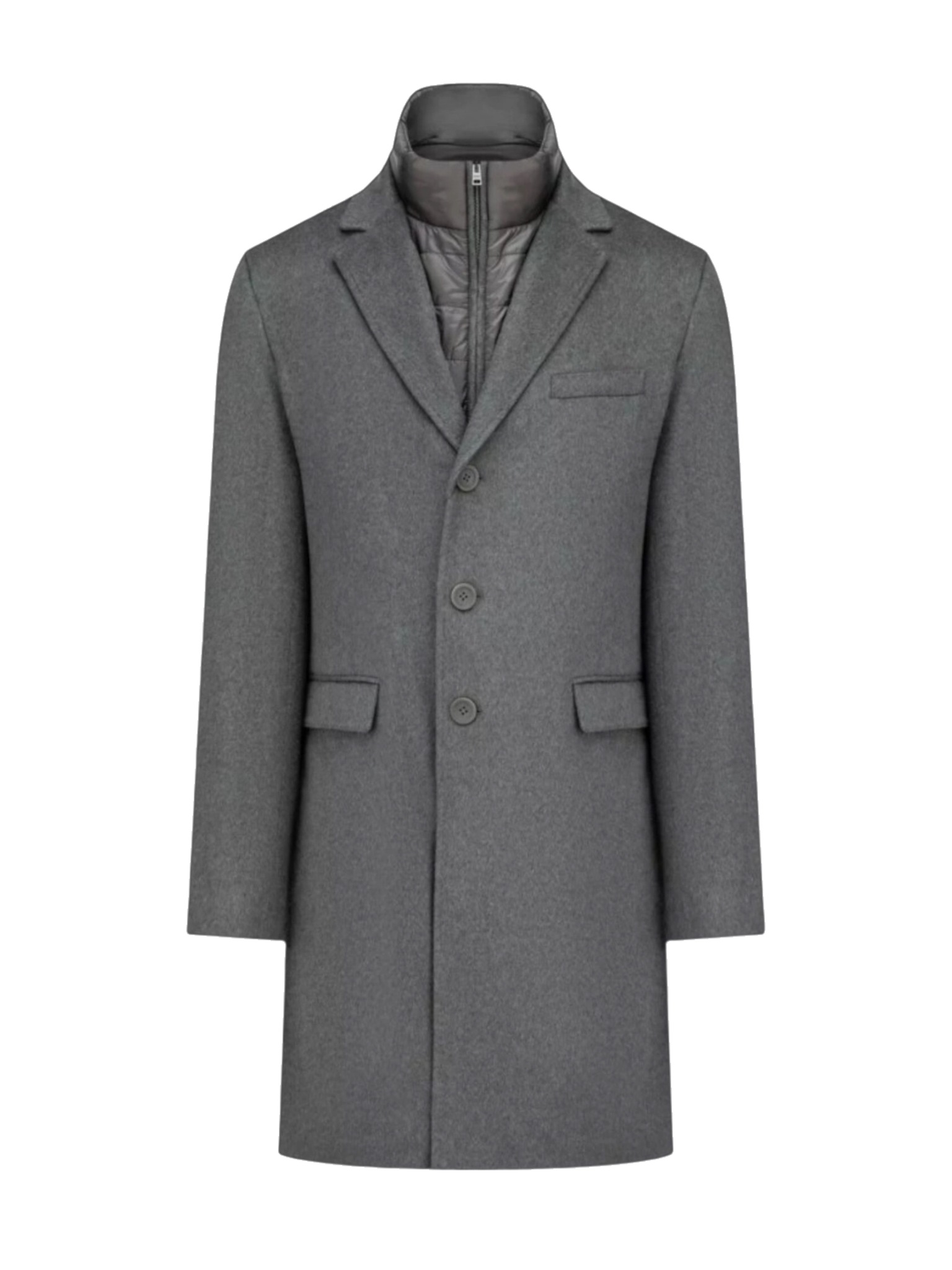 Пальто Herno - это безупречный комфорт и итальянское мастерство. Это серое пальто сшито из исключительно мягкой смесовой шерсти с добавлением кашемира, дарящей тепло и благородную фактуру. Приталенный крой подчеркивает силуэт, сохраняя элегантную легкость. Ключевая особенность - съемная нагрудная часть на молнии, позволяющая мгновенно трансформировать образ от классического до более лаконичного. Функциональные прорезные карманы с клапанами, отложной воротник и лацканы завершают безупречный дизайн. Основная застежка на пуговицы обеспечивает надежность. Идеальное сочетание традиционного качества HERNO, инновационной многофункциональности и вневременной серой палитры для мужчин, ценящих подлинный стиль и комфорт в любой ситуации.
