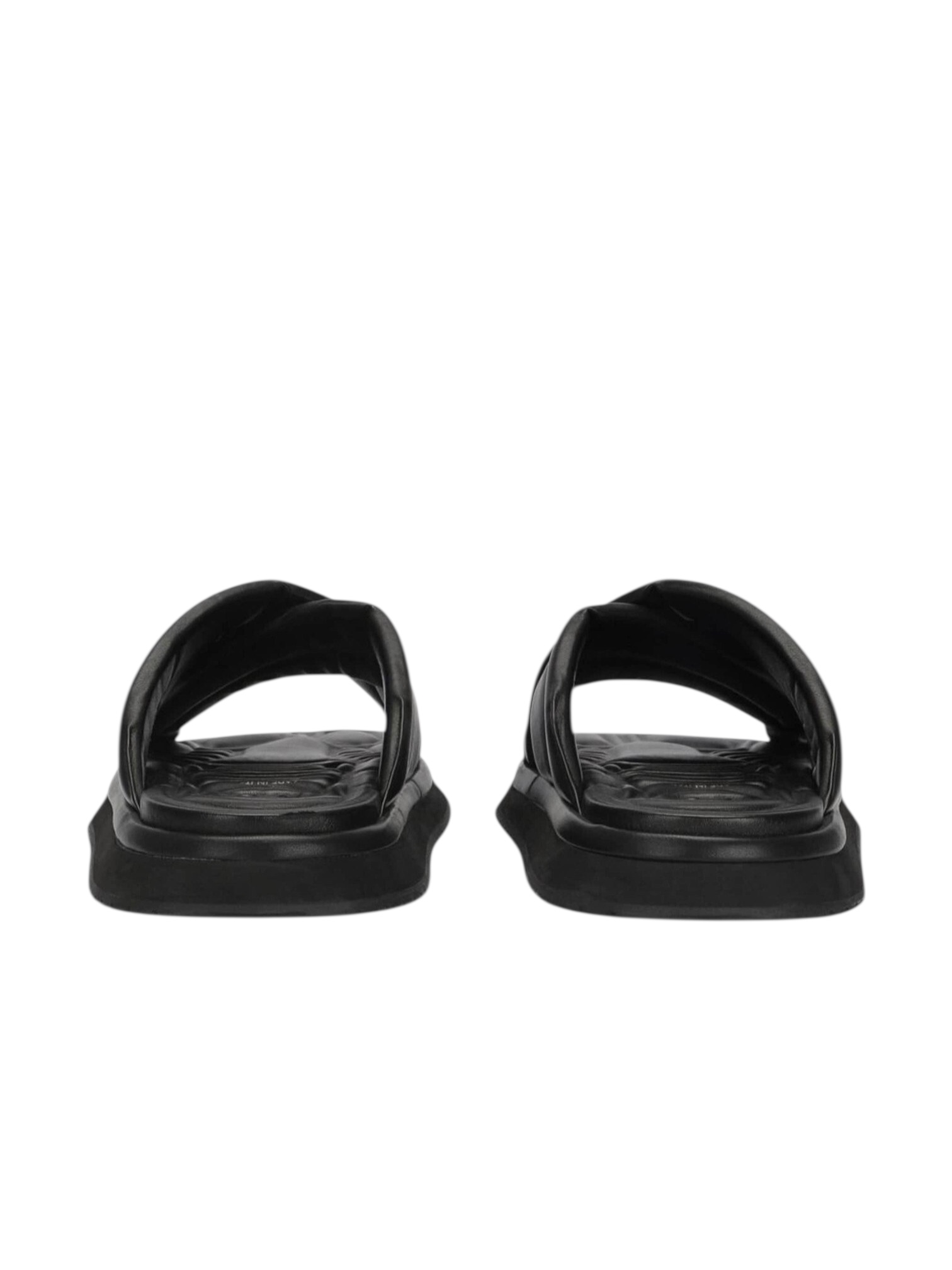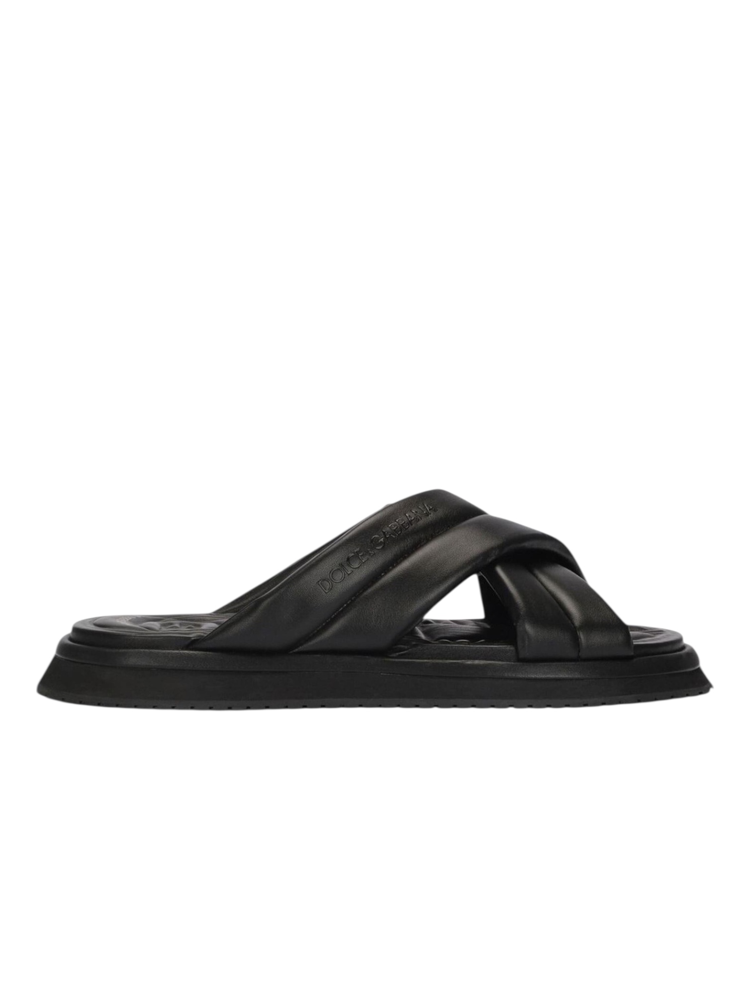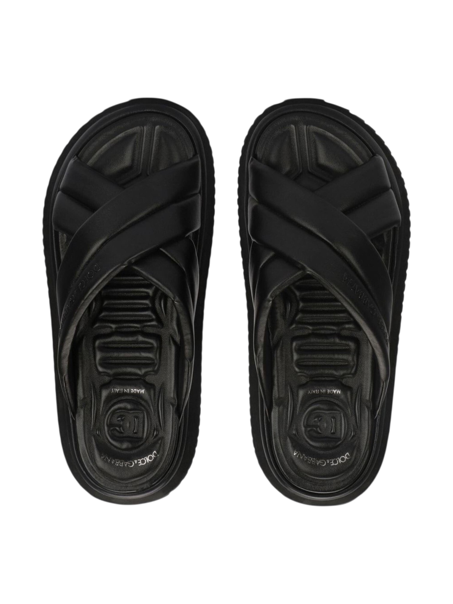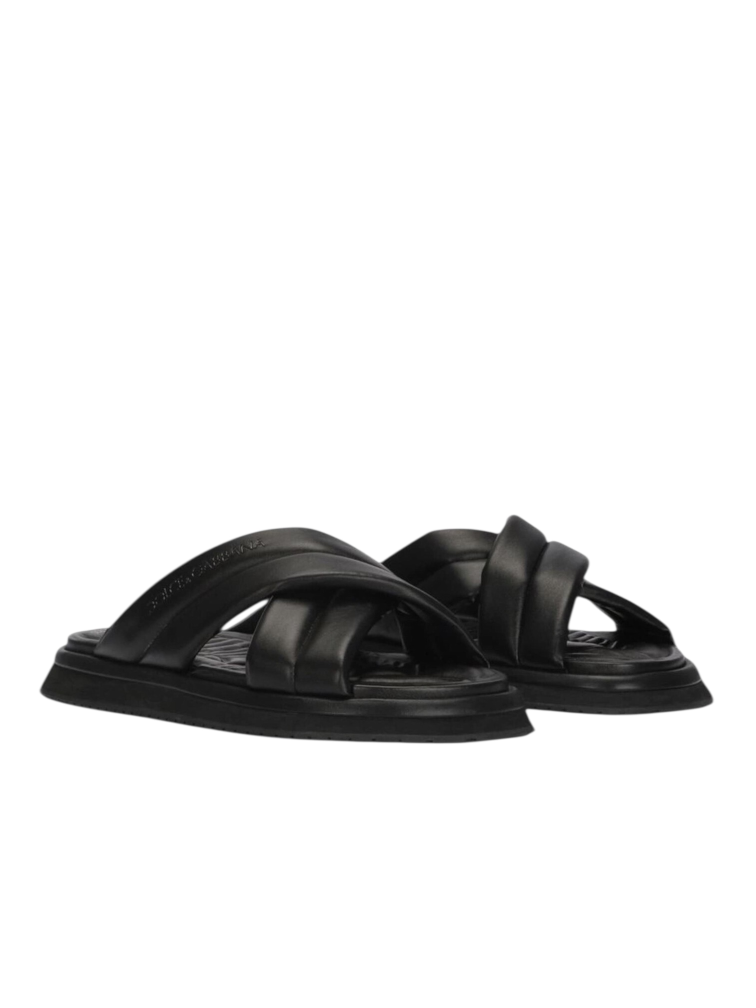 Пантолеты Dolce&Gabbana - выполненные из искусственной кожи глубокого черного цвета. Модель украшена тиснёным логотипом бренда по бокам, подчеркивающим статусность и внимание к деталям. Перекрещивающиеся ремешки создают сложный, но элегантный дизайн, а форма слипонов обеспечивает удобство и легкость ношения. Открытый носок и плоская подошва гарантируют комфорт, делая эти сандалии идеальным выбором для теплого сезона. Идеально для: курортного отдыха, городских прогулок и летних мероприятий, где важны стиль, комфорт и итальянская роскошь.
