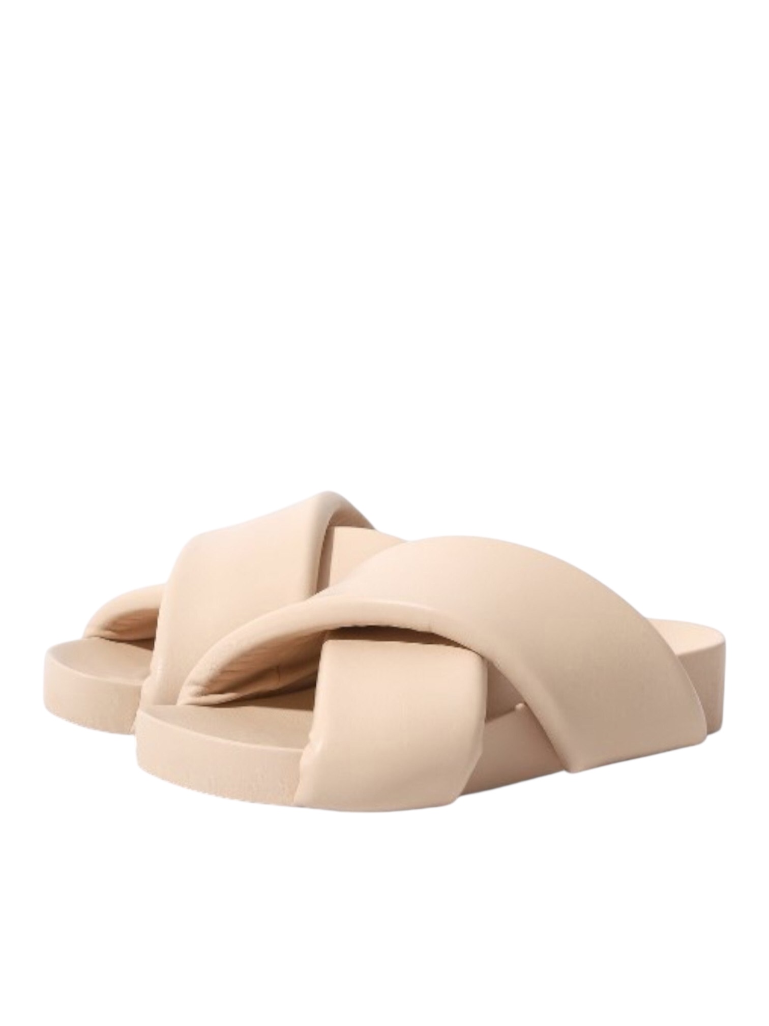 Пантолеты Jil Sander - воплощающие эстетику чистых линий и безупречного качества. Модель выполнена в бежевом оттенке из мягкой кожи, что подчеркивает утонченность и универсальность. Перекрещивающиеся ремешки создают элегантный дизайн, а форма slip-on обеспечивает удобство и легкость ношения. Массивная резиновая подошва добавляет контраст и устойчивость, сохраняя при этом легкость и комфорт. Эти сандалии станут идеальным дополнением летнего гардероба. Идеально для: городских прогулок, курортного отдыха и летних мероприятий, где важны лаконичность, качество и сдержанный стиль.
