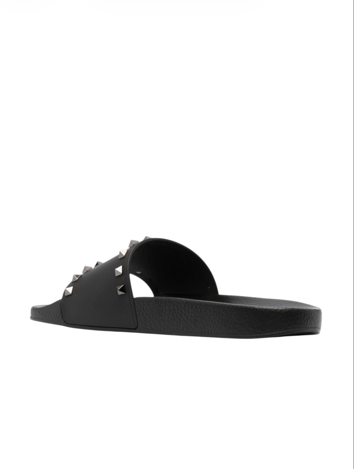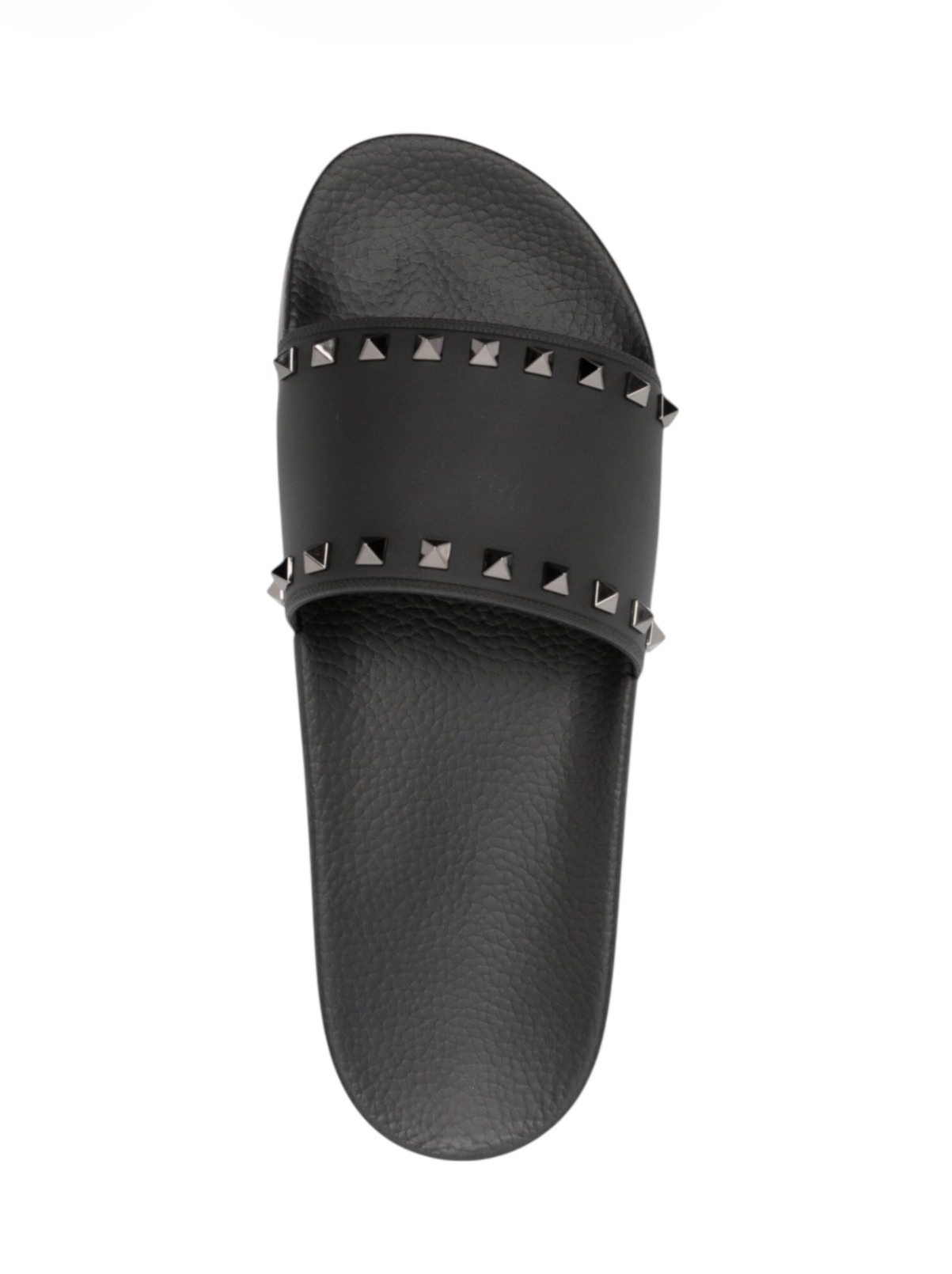 Пантолеты Valentino Garavani - украшенные знаменитой отделкой Rockstud. Модель выполнена в черном цвете, подчеркивающем брутальную элегантность дизайна. Формованная стелька обеспечивает анатомический комфорт, а стиль слип-он позволяет легко и быстро обуваться. Плоская резиновая подошва гарантирует устойчивость и удобство при ходьбе. Эти сандалии станут смелым акцентом в вашем образе, сочетая в себе неповторимый стиль Valentino и практичность. Идеально для: городских прогулок, вечеринок и повседневной носки, где важны стиль, комфорт и наследие бренда.