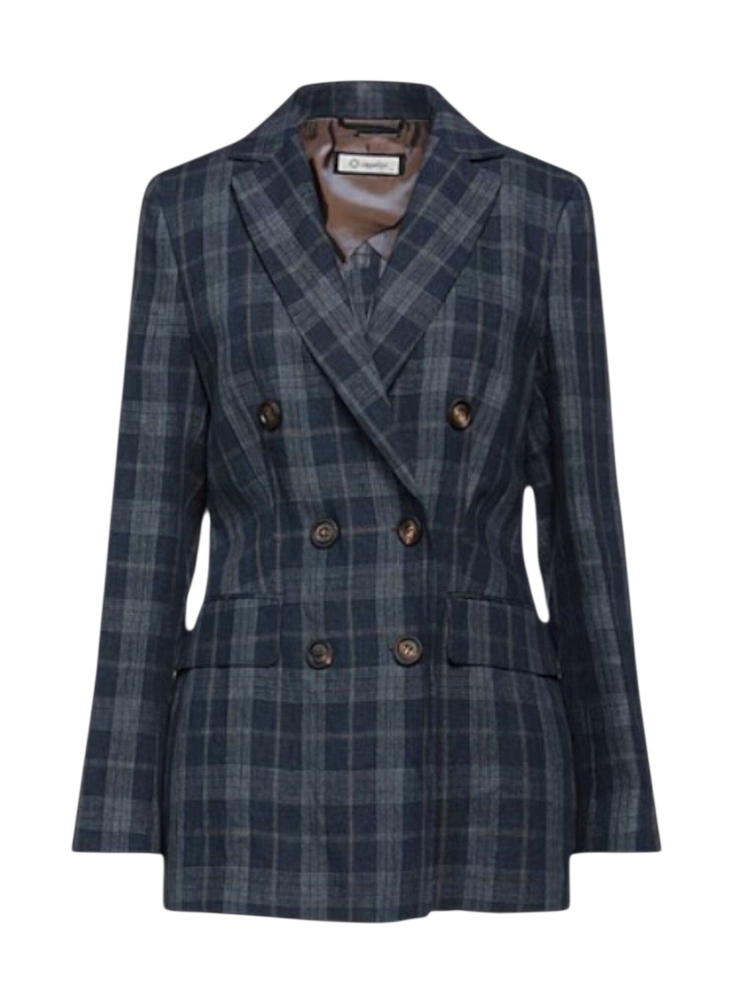 Пиджак Cappellini - выполнен в темно-синей клетке с оттенками серого и зелёного. Модель выполнена в стиле двубортного кроя с шестью декоративными пуговицами спереди. Приталенный силуэт подчёркивает фигуру. Классический отложной воротник с острыми лацканами. Такой пиджак идеально подойдёт как для деловых образов, так и для smart casual стиля - комбинируется с брюками, юбками или джинсами.