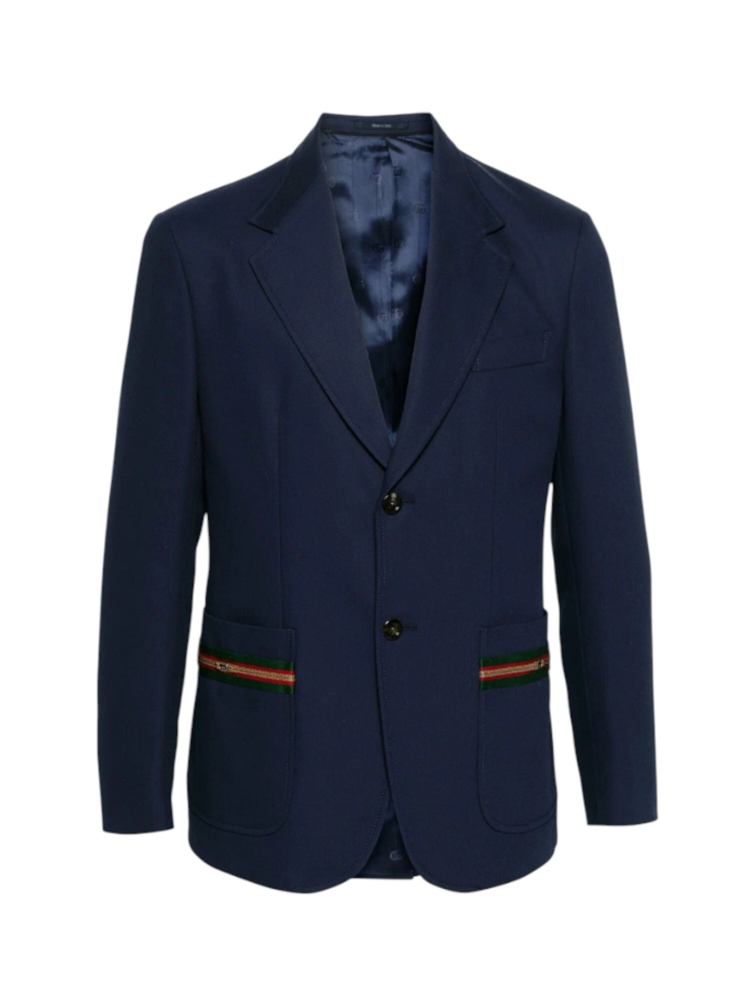 Пиджак Gucci - выполненный из высококачественного хлопка в насыщенном темно-синем цвете. Модель сочетает в себе классический крой и узнаваемые коды Дома. Отделкой служит культовая полоска Веб - символ наследия бренда, добавляющий образу динамики и престижности. Строгие классические лацканы, застежка на пуговицы и два накладных кармана формируют сдержанный силуэт. Длинные рукава, прямой подол и центральная вентиляционная прорезь сзади обеспечивают комфорт и соответствуют канонам традиционного кроя.