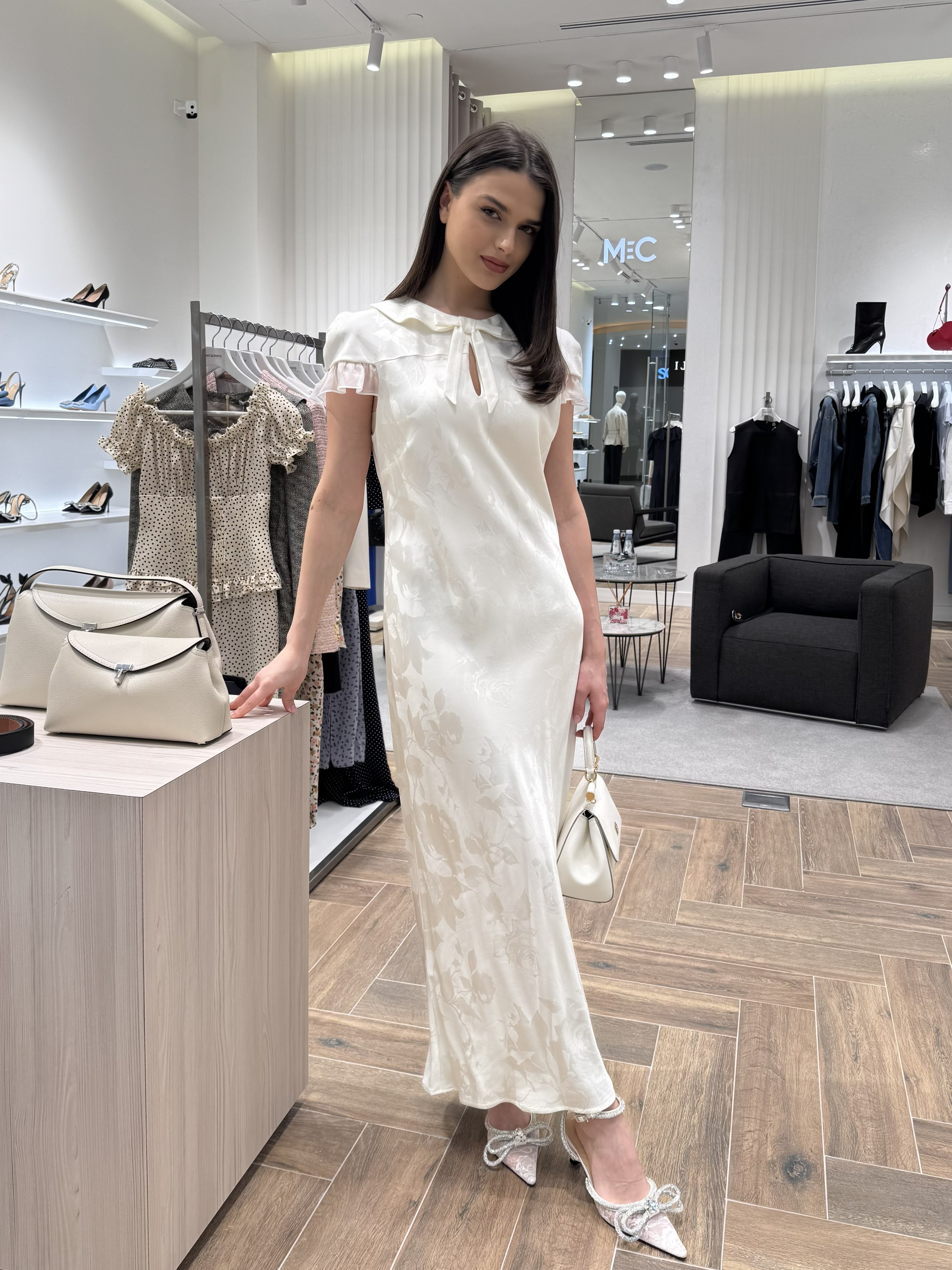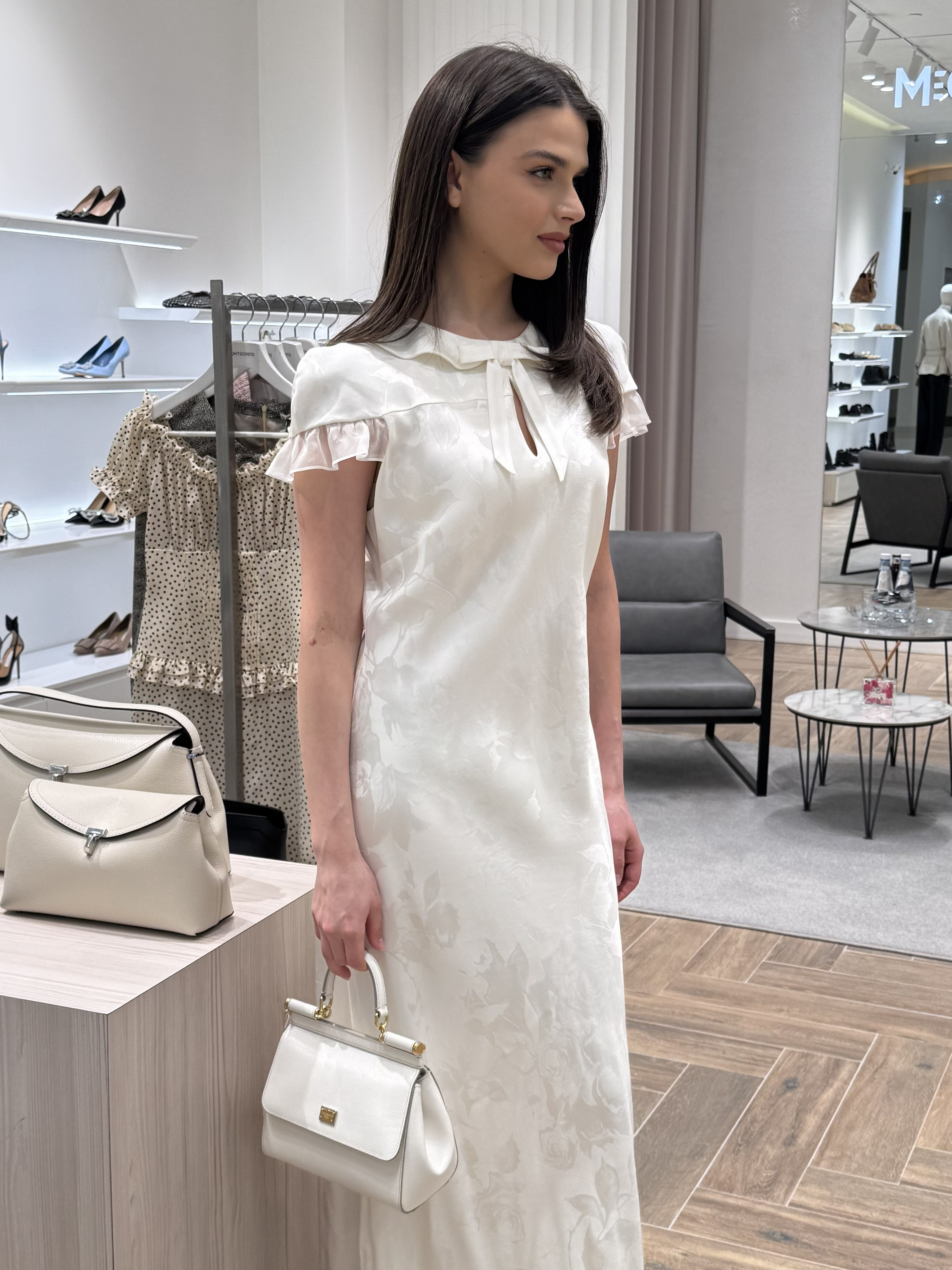 Платье Alessandra Rich - это модель в белом цвете воплощает изысканный британский гламур, любимый иконами стиля и королевскими особами. Крой миди с высокой талией, А-силуэтом или аккуратным прилеганием подчеркивает женственность, сохраняя комфорт и легкость движения. Это платье - не просто наряд, а предмет искусства, добавляющий любому событию ауру безупречного вкуса и статусной эстетики Alessandra Rich.