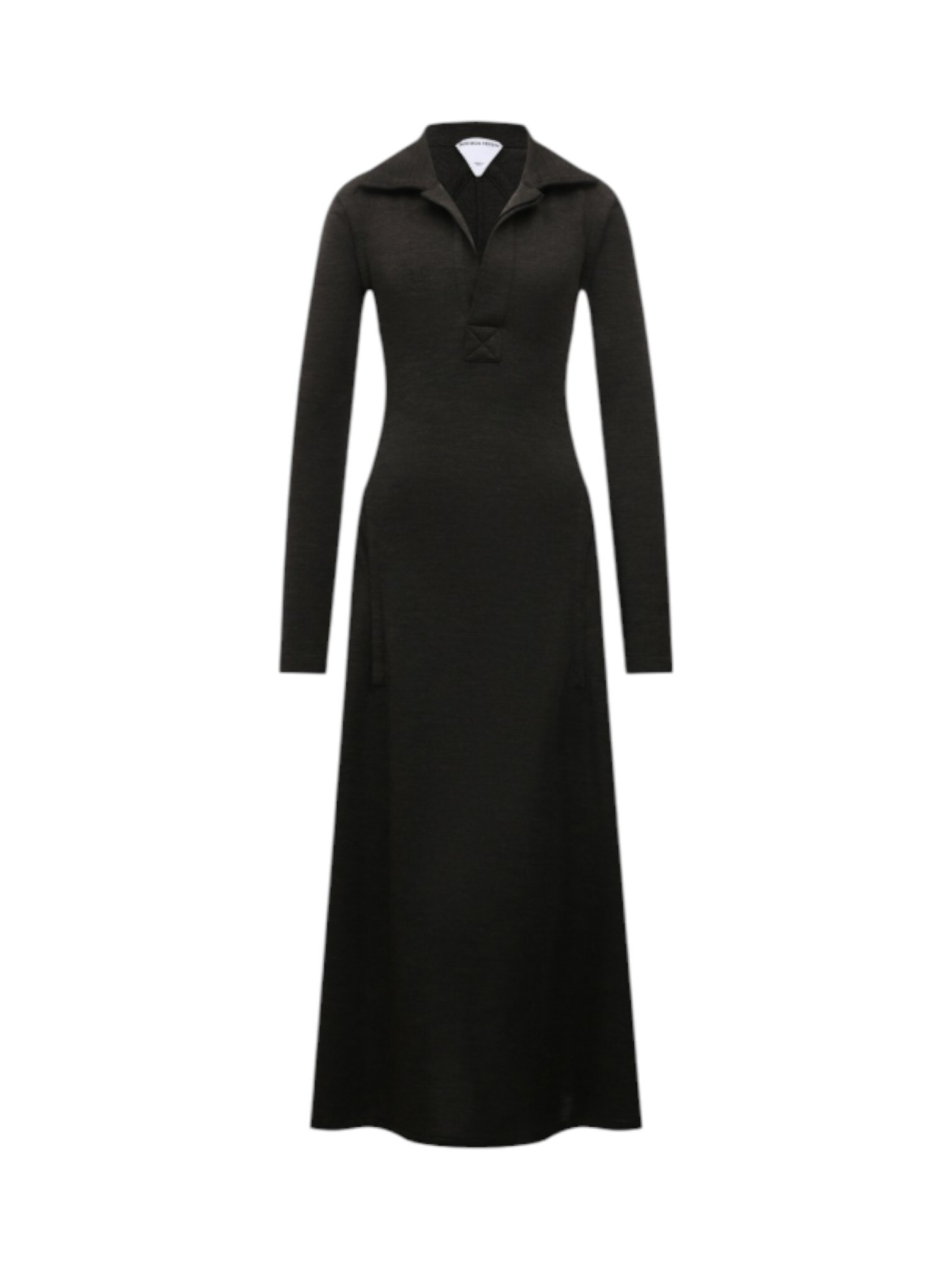 Платье Bottega Veneta - олицетворяет идеал сдержанной роскоши и безупречного кроя. Модель с V-образным вырезом и классическим отложным воротником отличается строгими, чистыми линиями. Длинные рукава и струящийся силуэт до пола создают выразительный, но лаконичный образ. Платье отражает фирменную философию бренда, делая акцент на безупречном мастерстве, качестве материалов и вневременном дизайне, который ценится за свою изысканную простоту