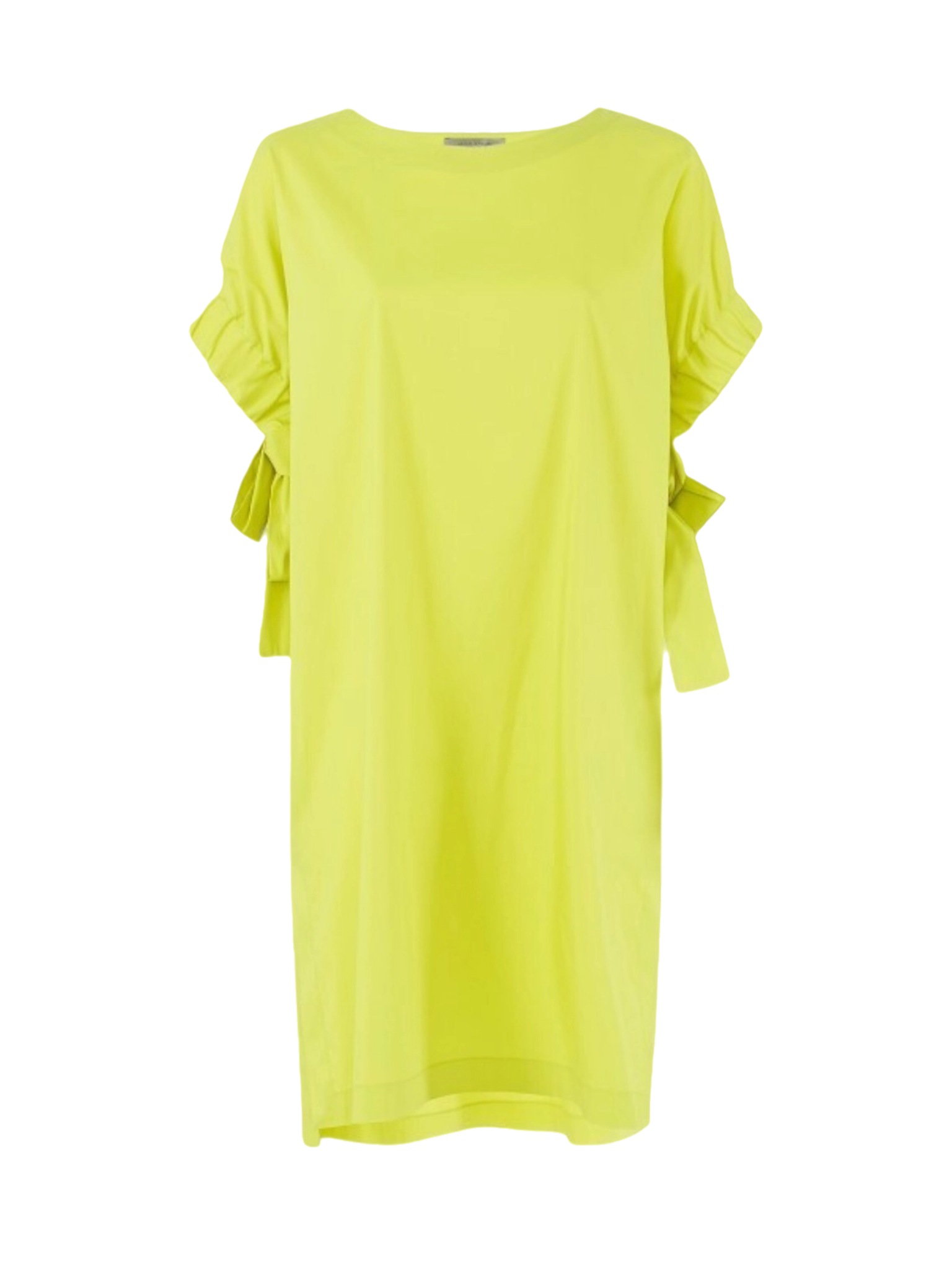 Платье D.Exterior - лимонно-желтого цвета. Платье имеет прямой, слегка свободный силуэт до колена.  Короткие рукава украшены драпировкой и завязками в виде бантиков, что добавляет игривый и женственный акцент. Вырез горловины круглый и лаконичный. Платье создает непринужденный, но стильный образ. Идеально подойдет для повседневной носки в летнее время.