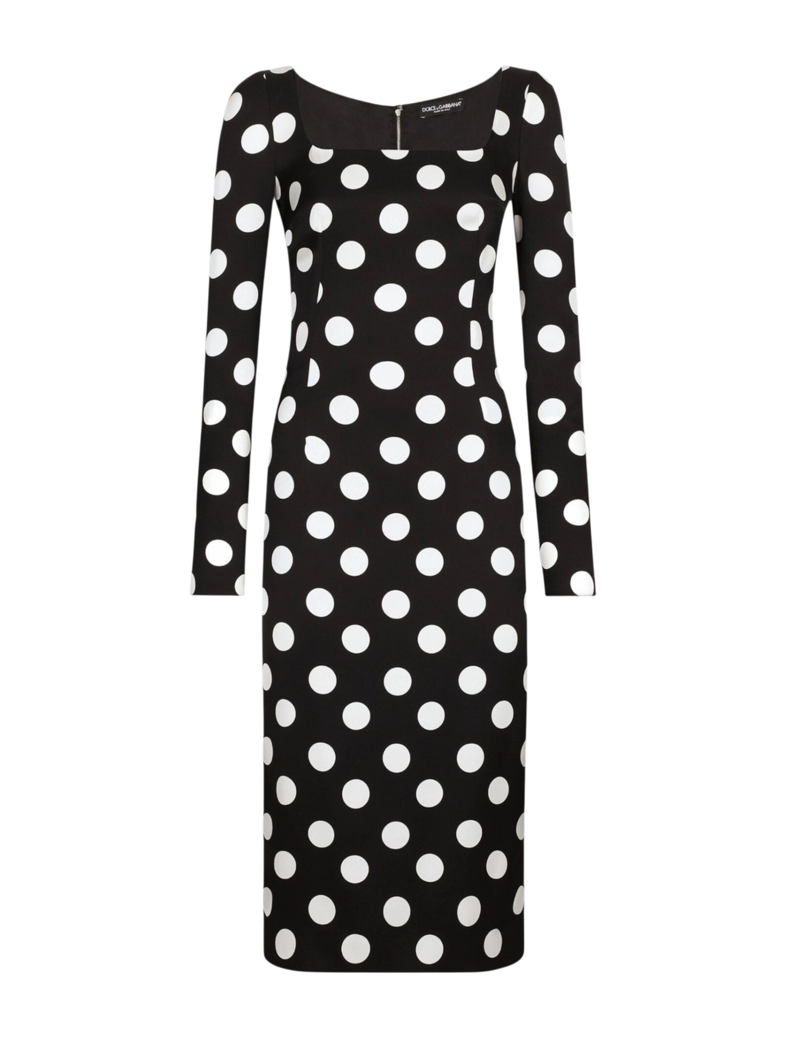 Платье Dolce&Gabbana - воплощение вневременного стиля. Выполненное из роскошного эластичного шелкового шармуза, оно облегает фигуру, подчеркивая женственность. Классический черно-белый горошек, создает динамичный и узнаваемый образ. Четкий прямой силуэт платья придает образу строгость и элегантность. Квадратный вырез горловины добавляет нотку современности, а длинные рукава обеспечивают универсальность для разных сезонов. Задний разрез на подоле вносит интригующую деталь и удобство при ходьбе. Длина миди делает платье идеальным выбором для коктейльных вечеров, светских раутов или особых событий, где важны стиль и комфорт. Dolce&Gabbana гарантирует высочайшее качество и безупречный крой.