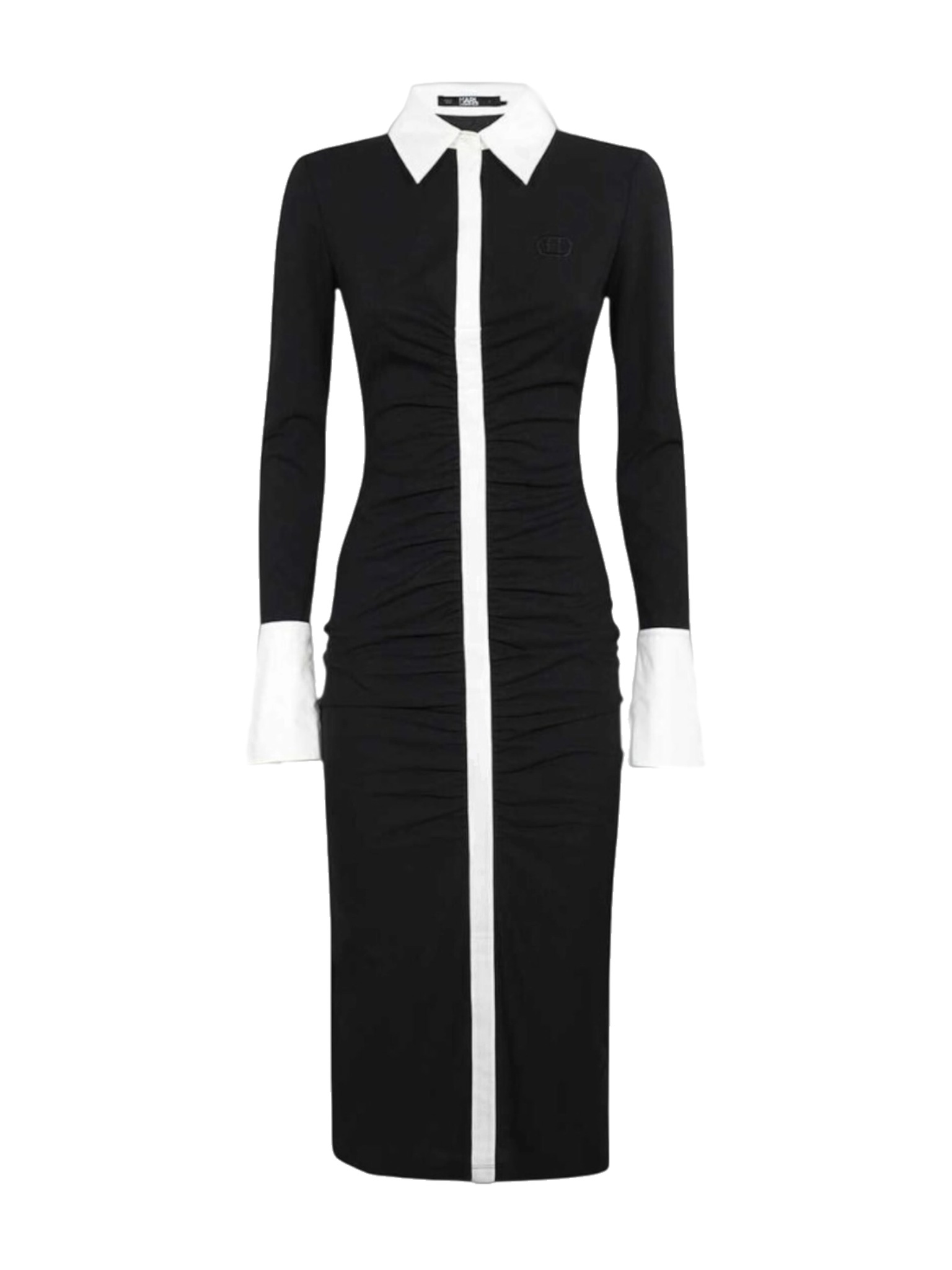 Платье Karl Lagerfeld - универсальный вариант для создания яркого образа. Это платье объединяет строгий воротник-поло и длинные рукава с элегантно высокими манжетами с неожиданными деталями с оборками, добавляющими объем и движение. Полная застежка на пуговицах спереди позволяет регулировать степень открытости и создает выразительную линию. Контрастная отделка подчеркивает продуманность кроя и фирменный подход бренда.