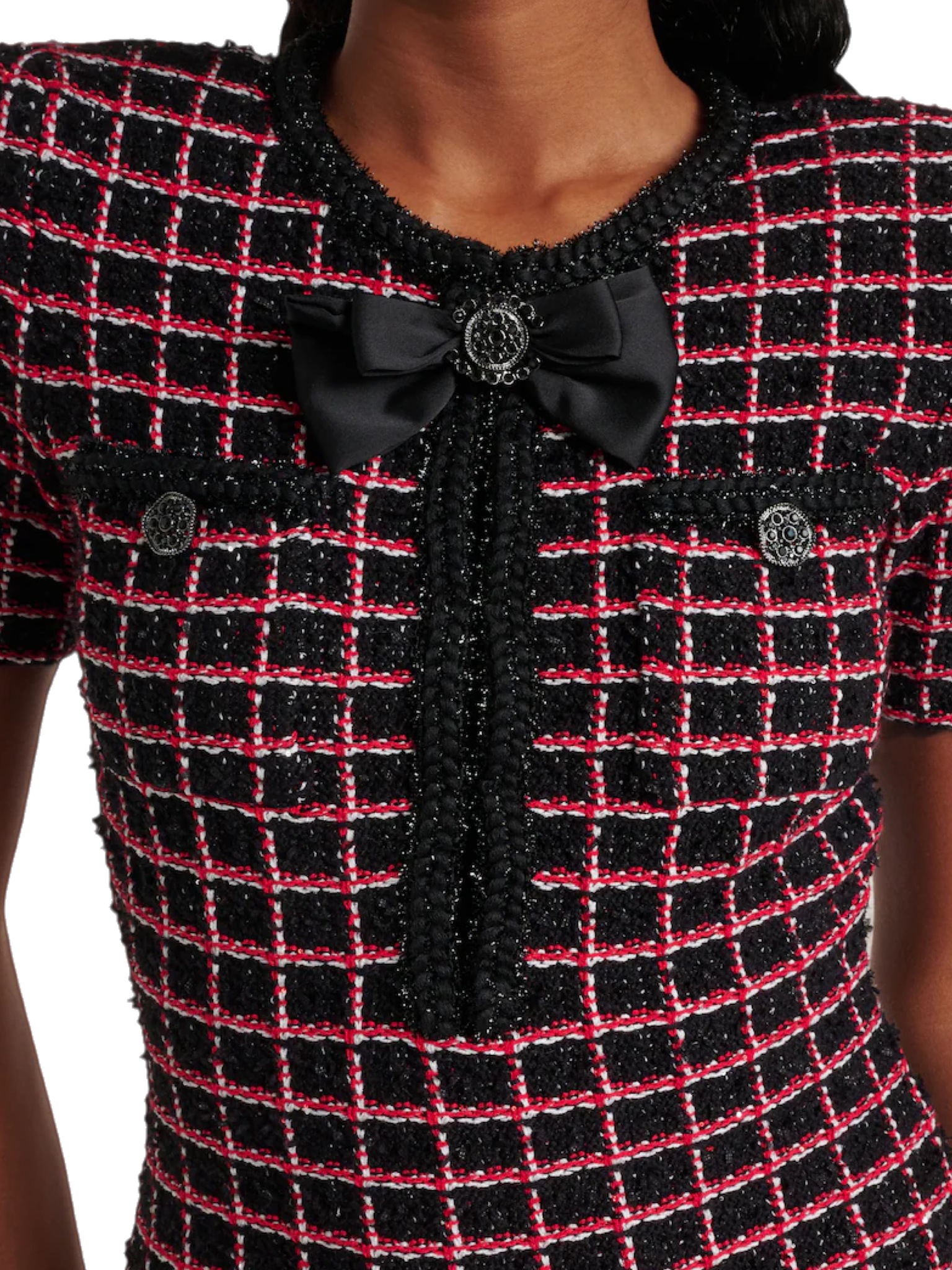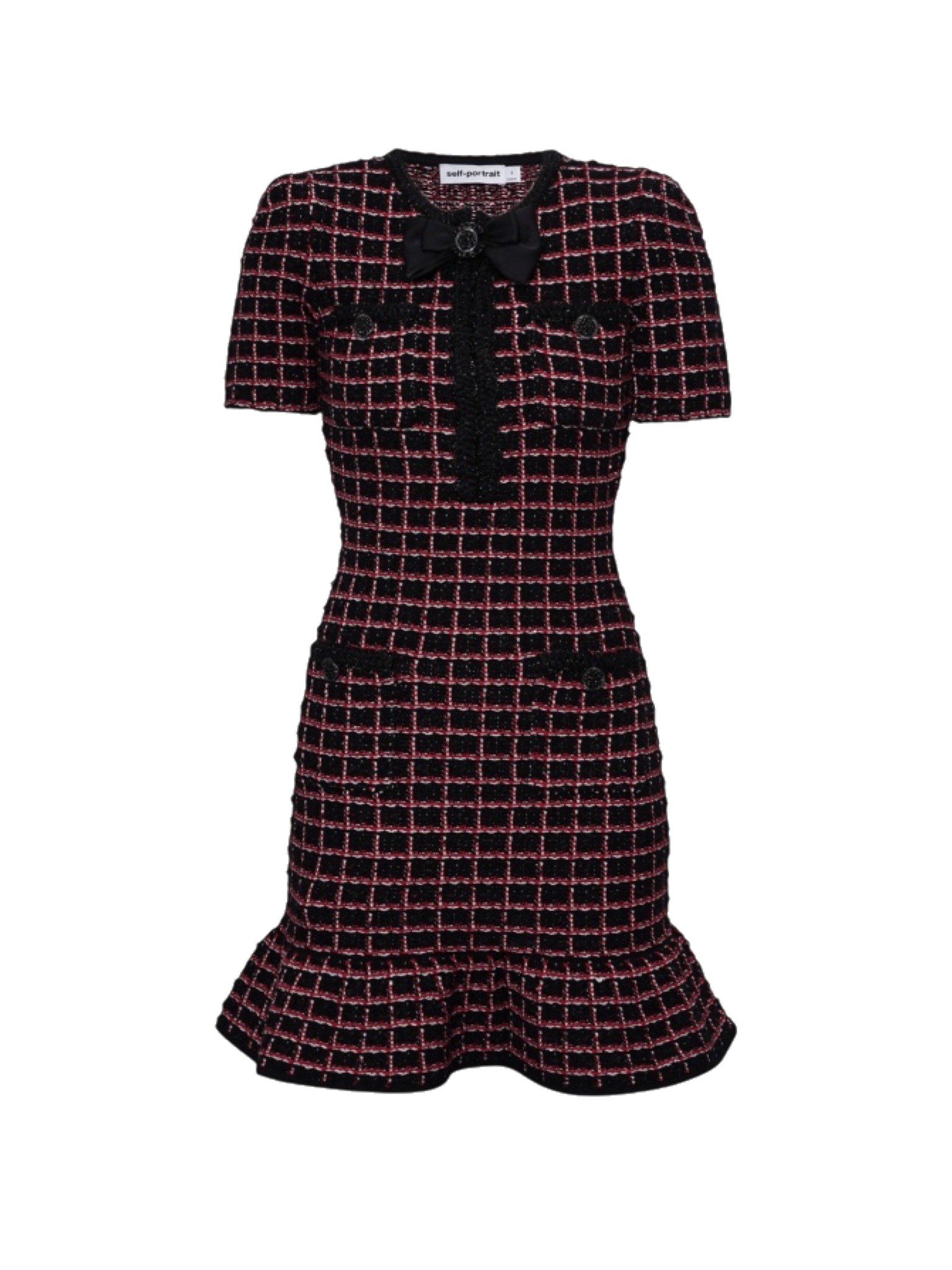 Платье Self-Portrait - выполнена в классическом стиле с короткими рукавами и декоративными карманами на пуговицах. Вырез оформлен чёрной отделкой с изящным бантом и украшенной стразами брошью, придающими образу нотку утончённой женственности. Низ платья дополнен аккуратным воланом, который создаёт мягкий акцент на линии бедра. Такое платье идеально подходит как для повседневных выходов, так и для особых случаев, сочетая современный крой с винтажными элементами.