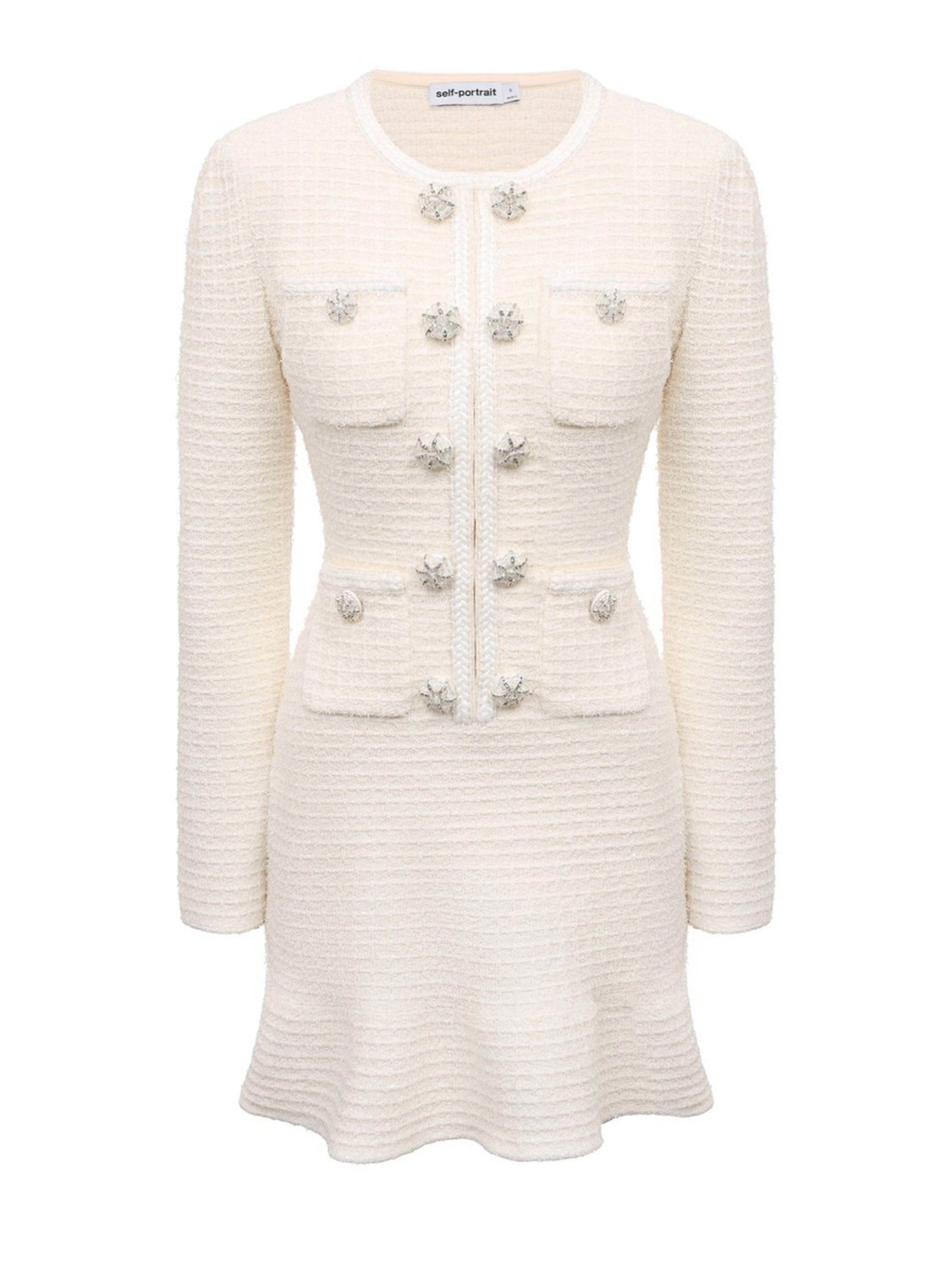 Погрузитесь в атмосферу утонченной элегантности с трикотажным платьем Self-Portrait. Это платье из мягкого трикотажа с текстурной вязкой обеспечивает комфорт и подчеркивает линии фигуры. Деликатные пуговицы со стразами и расклешенная юбка создают романтичный и эффектный образ. Съемные подплечники и функциональные карманы добавляют универсальности и практичности