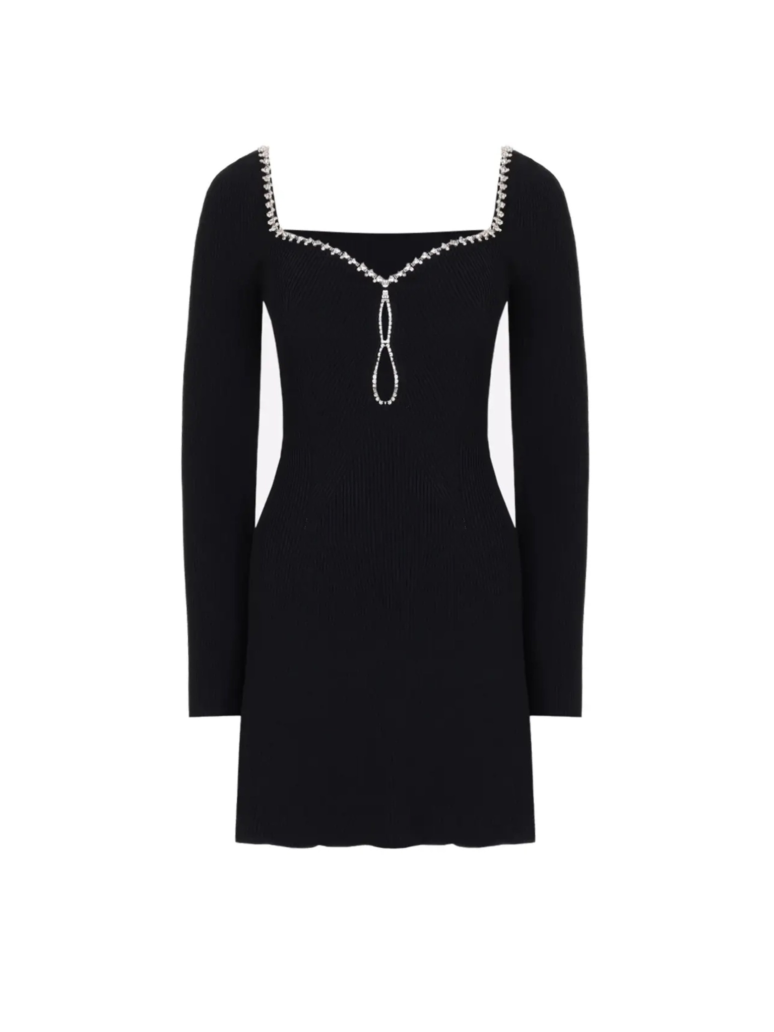Погрузитесь в мир стиля с этим черным мини-платьем, выполненным из текстурного трикотажа в рубчик. Бандажный крой подчеркивает вашу фигуру, а фигурный вырез декольте, украшенный крупными стразами, добавляет блеска и гламура. Длинные рукава создают интересный контраст с длиной мини и открытыми вырезами на груди и спине, делая это платье одновременно смелым и изысканным.