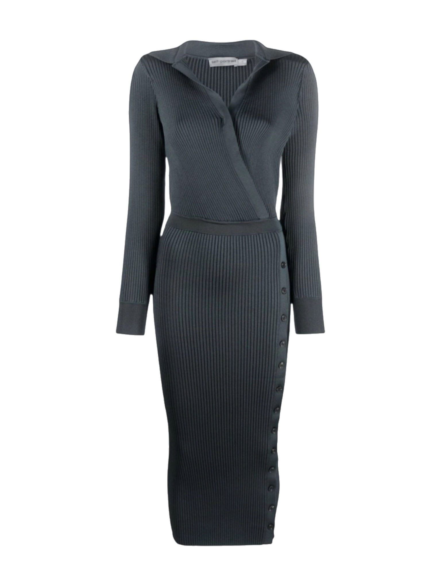 Платье Self-Portrait - выполнено в элегантном сером цвете. Его секрет в акцентированной линии плеч. Модель выполнена из нежного рифленого трикотажа на основе шелковистой вискозы, что обеспечивает невероятный комфорт и идеальное облегание фигуры. Глубокий V-образный вырез с отложным воротником добавляют изысканности. А функциональные пуговицы по всей длине подола позволяют создать разрез, приоткрывающий ногу по вашему желанию