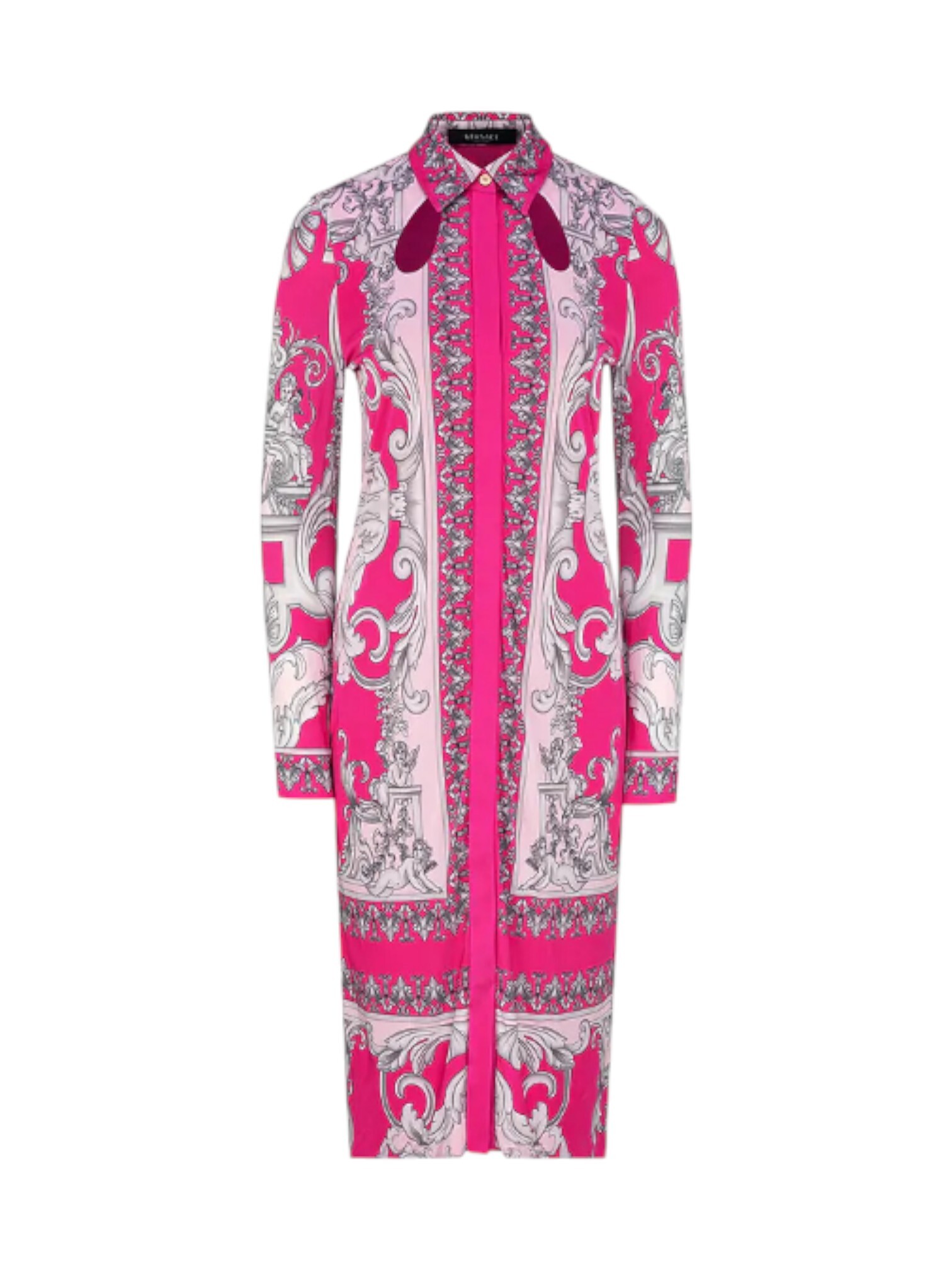 Платье Versace - не просто одежда, это территория. Территория, где классическая форма становится полотном для дионисийского орнамента, а сдержанный силуэт - театральной сценой для фирменной эксцентрики Дома. Принт по всей поверхности - это главный герой. Не отдельный мотив, а тотальный, гипнотический узор. Строгий классический воротник и длинные рукава выступают в роли идеальной рамы для этого живописного полотна. Они дисциплинируют безумие принта, создавая напряжение между сдержанностью кроя и экспрессией рисунка. Это платье - для тех, кто не просит внимания, а требует его.