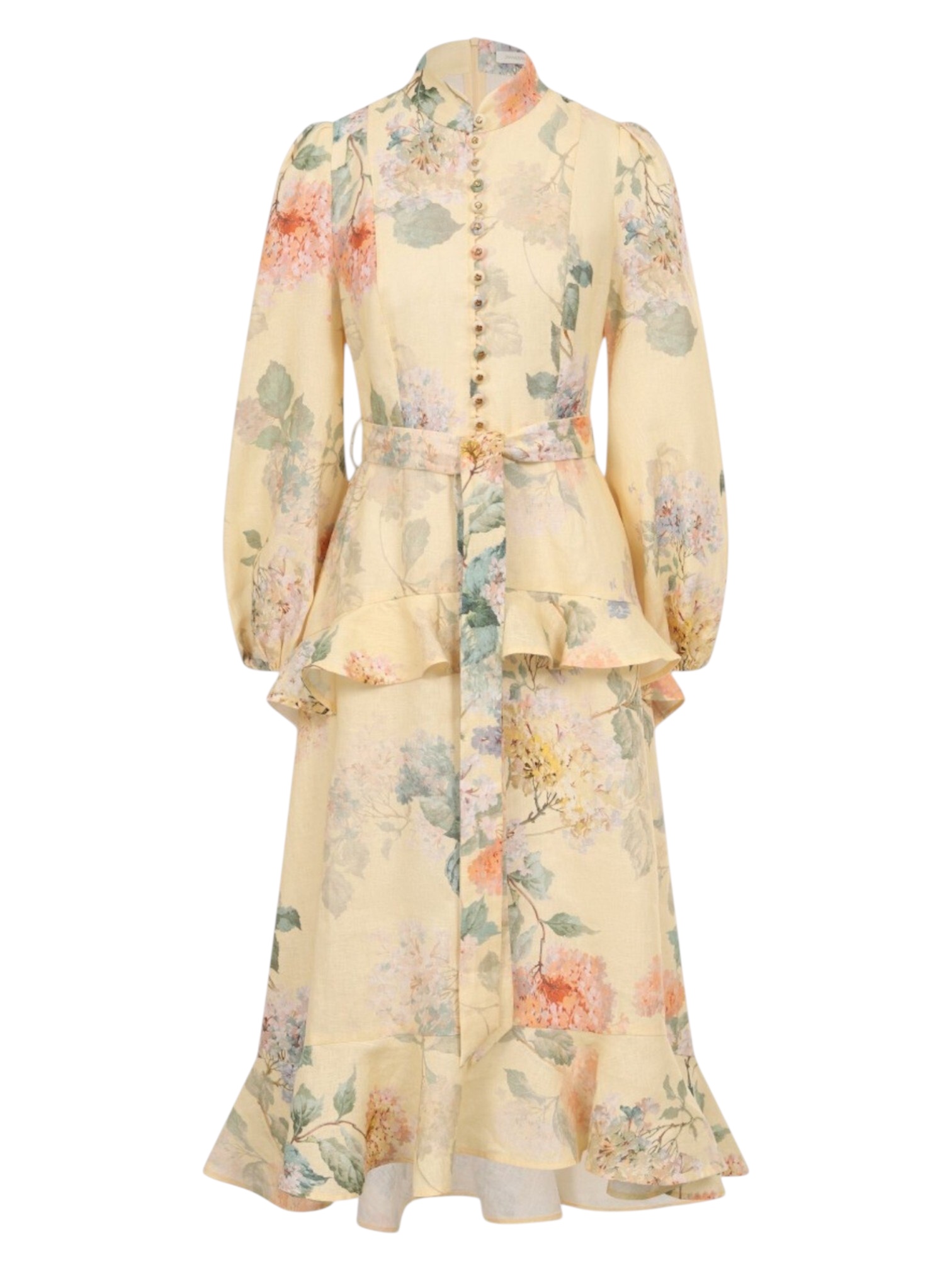 Платье Zimmermann - воплощающее идею современной романтики. Модель сконструирована из натуральной дышащей льняной ткани с эксклюзивным цветочным принтом в свежей лимонно-голубой гамме. Фирменный силуэт подчеркнут асимметричными оборками на подоле и объемными рукавами, создающими динамичный, выразительный образ. Передняя часть лифа декорирована рядом золотистых пуговиц, добавляющих ноту ретро-шика. Застежка на потайную молнию сзади обеспечивает чистую линию и удобство. Модель дополнена поясом-лентой для акцента на талии.