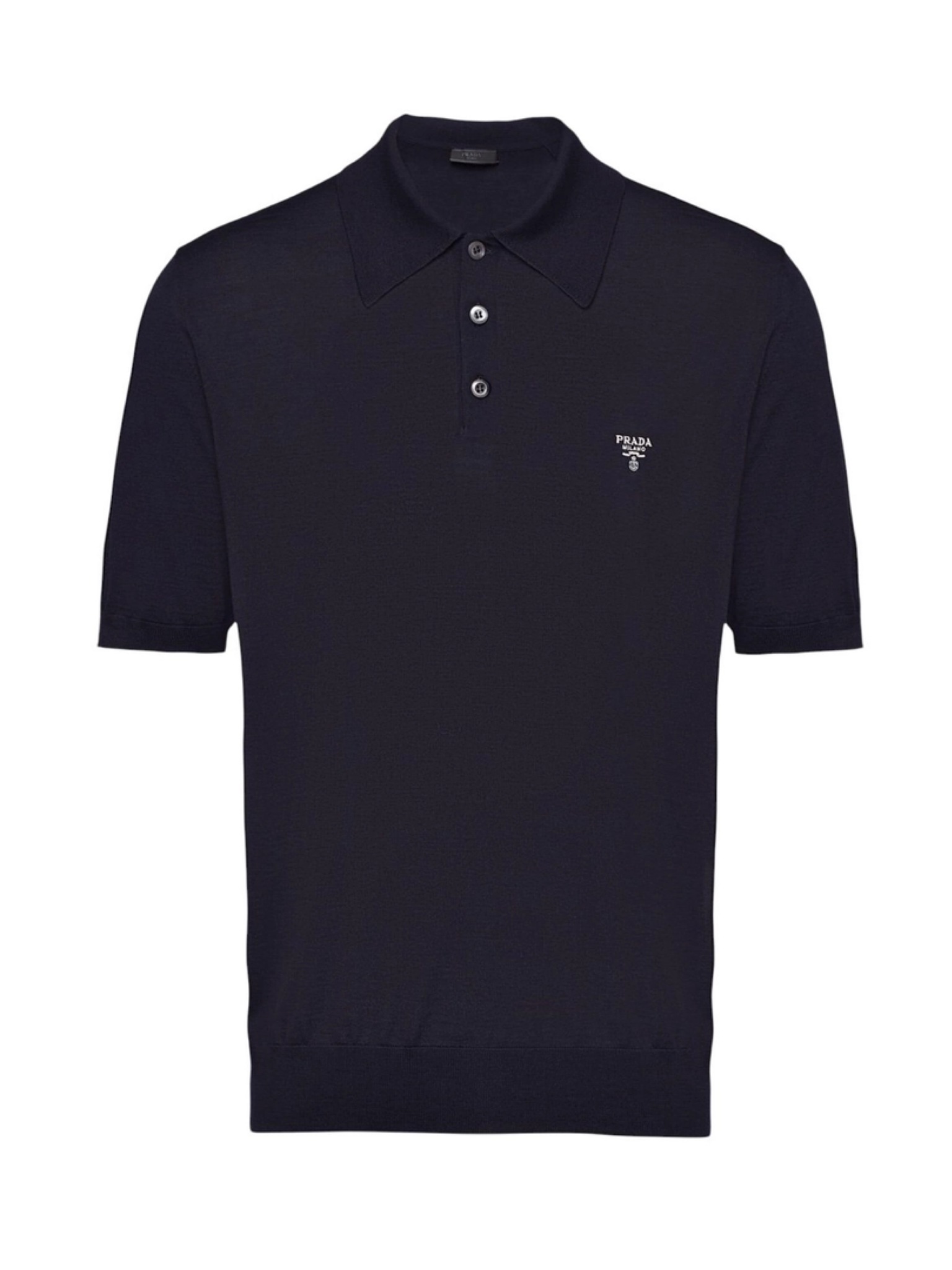 Поло Prada - образец безупречного стиля и премиального качества. Модель изготовлена из чистой шерсти тонкой вязки, что обеспечивает исключительный комфорт, легкость и превосходную терморегуляцию. Классический крой с короткими рукавами и прямым подолом. Планка на пуговицах и отложной воротник добавляют модели элегантности. Вышитый на груди логотип Prada выполнен с ювелирной точностью и подчеркивает наследие бренда. Темно-синий цвет делает поло универсальным элементом гардероба, который легко сочетается с брюками чинос, шортами или джинсами.