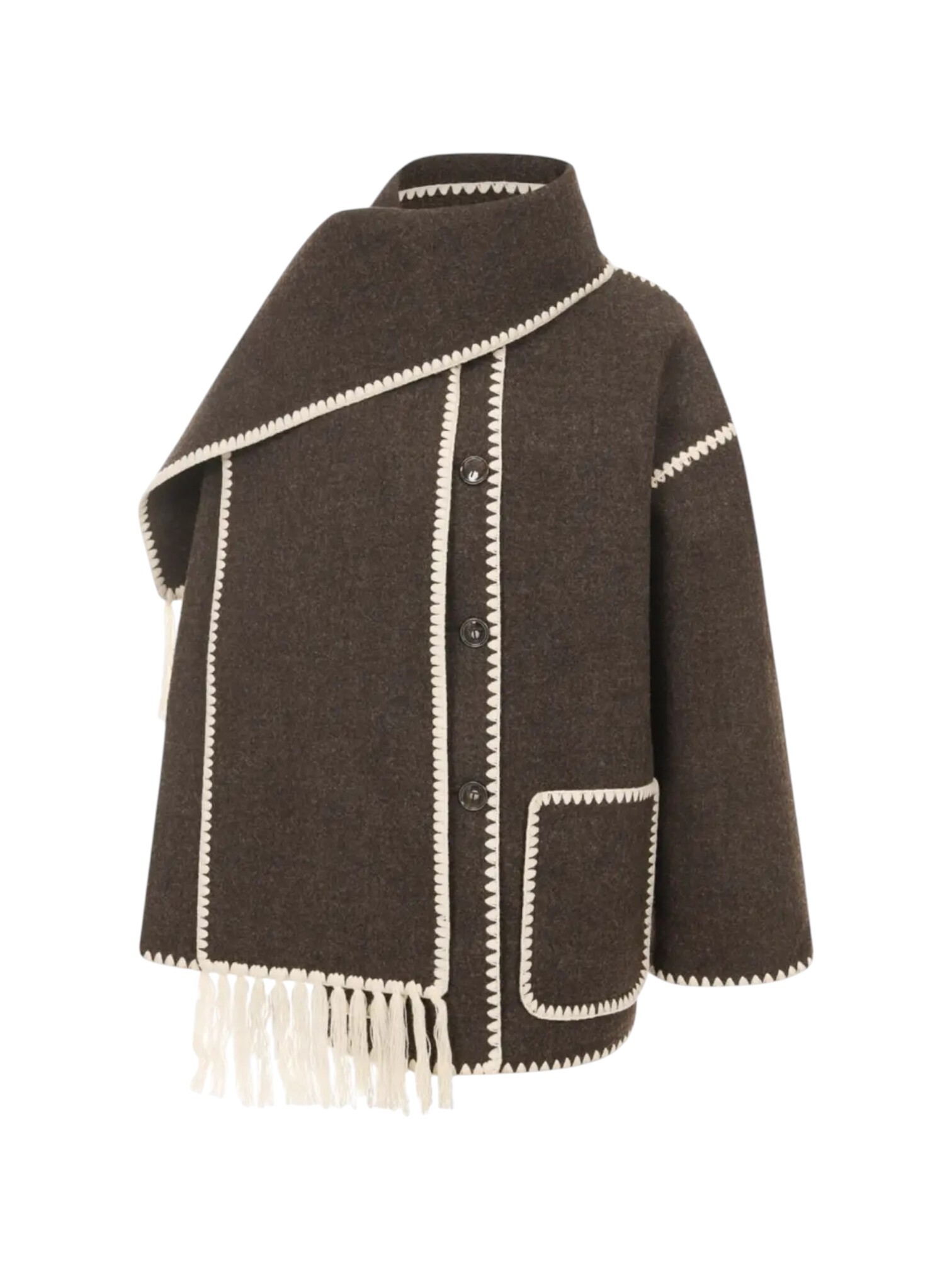 Полупальто Totême - не просто верхняя одежда, а тщательно продуманный образец скандинавского дизайна, где каждая деталь имеет значение. Модель с лаконичным однобортным кроем, двумя накладными карманами и культовым широким воротником-шалем с бахромой. Деталь ручной работы - отделка краев контрастными обметочными стежками - подчеркивает исключительное внимание к деталям. Оно станет завершающим акцентом любого образа, от повседневного с джинсами и ботинками до элегантного с платьем и сапогами.