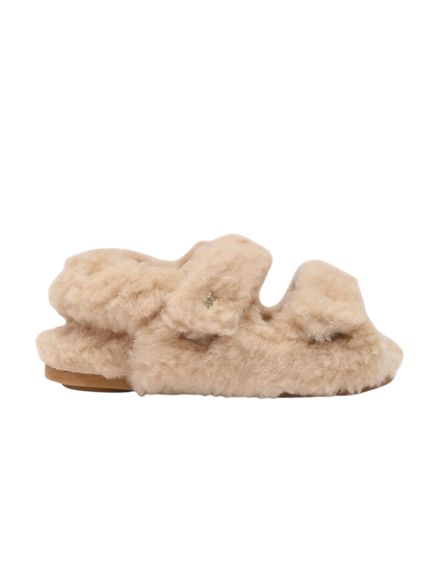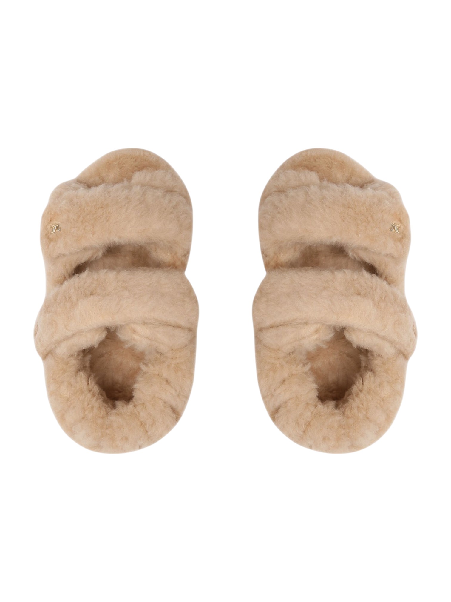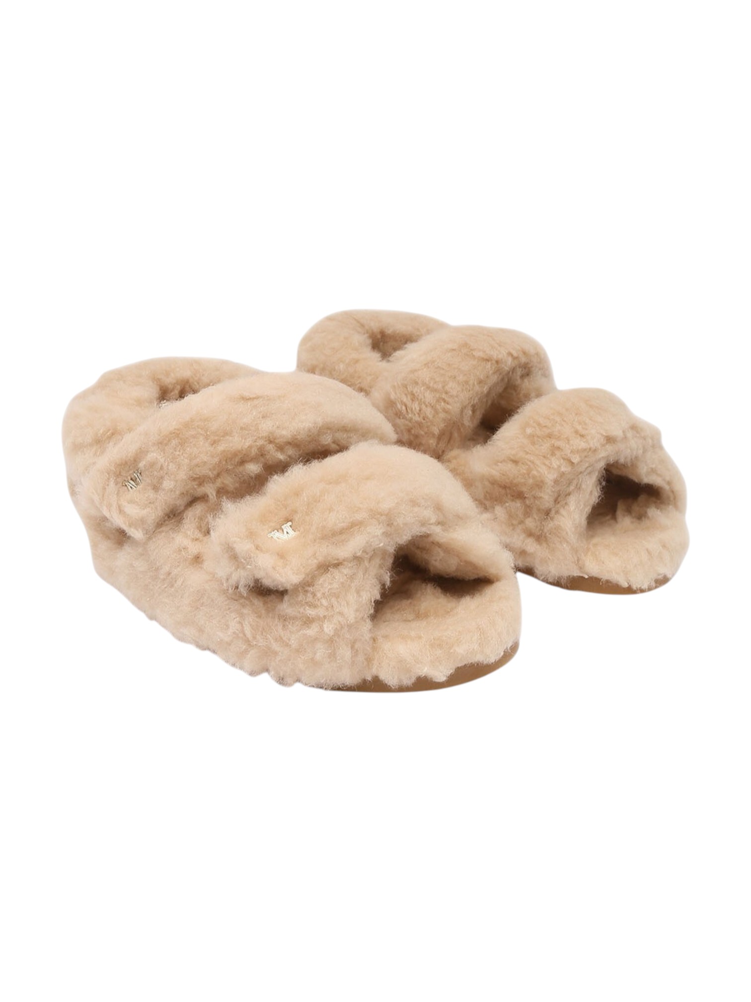 Сандалии Max Mara - стильная и уютная модель, выполненная из мягкого бежевого меха. Дизайн с двумя широкими ремешками и регулируемыми застёжками обеспечивает комфортную посадку, а открытый носок придаёт образу лёгкость. Подошва выполнена из прочного материала, обеспечивающего устойчивость и удобство при ходьбе. Идеальный выбор для домашнего уюта или расслабленных образов в тёплое время года.